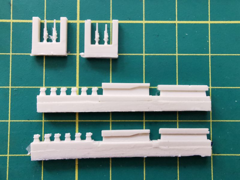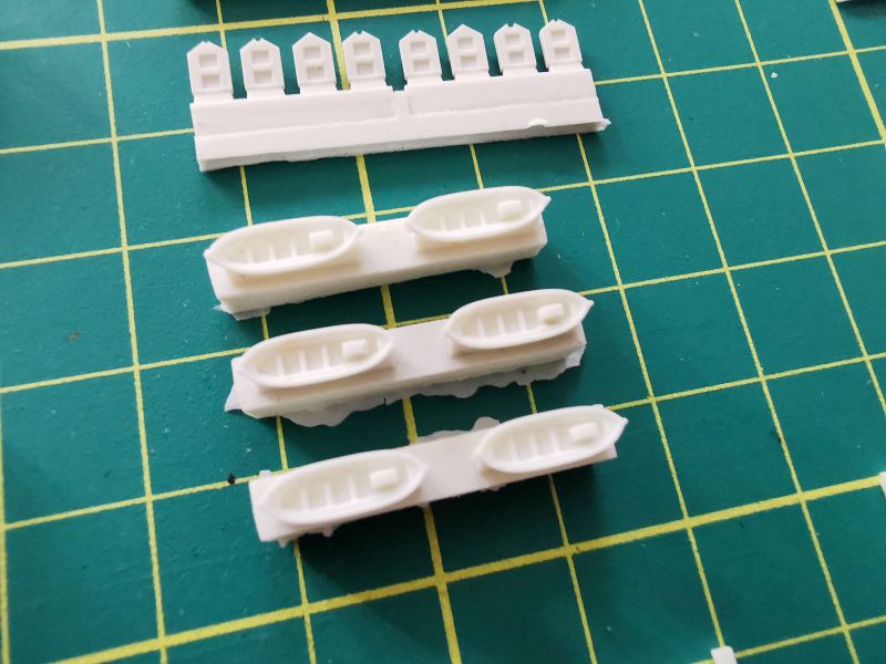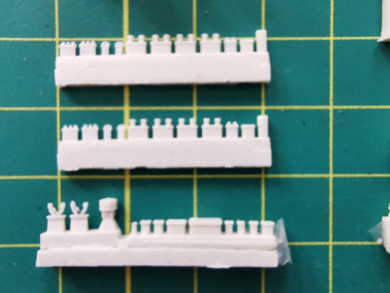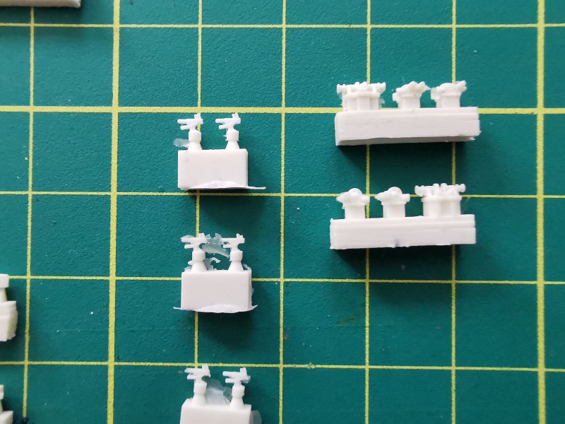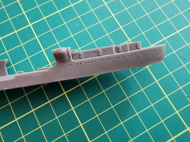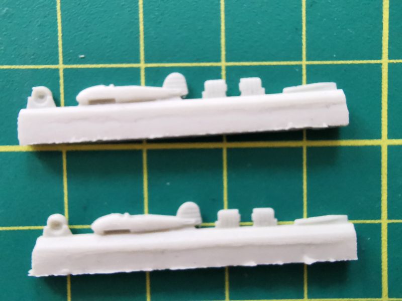 Znajdują się one głównie na pionowych ścianach nadbudówek czy burtach. Niemal wszystkie detale wyposażenia pokładu, wykonano jako osobne elementy i musimy je przykleić w odpowiednio zaznaczonych miejscach. Iluminatory wykonano w sposób bardzo wyraźny, otwory przelewowe w nadburciach jedynie zaznaczono. W swoim modelu zdążyłem je wyciąć. Jako żywiczne odlewy wykonano także kolejne kondygnacje nadbudówek. W żadnych dotychczas omówionych elementach nie znalazłem jakiś wad w postaci nie dolewek czy pęcherzy powietrza. Trochę da w kość wycinanie nadbudówek z dość szerokich klocków wlewowych, no ale cóż, taki urok żywicznych modeli okrętów.