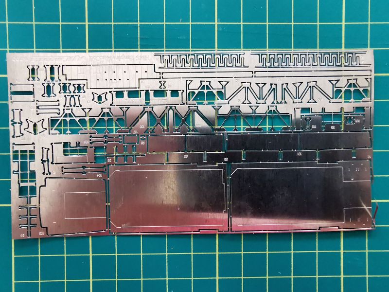 Fototrawione blaszki są dwie, przy czym jedna jest grubsza, a na niej znajdziemy wszystkie elementy konstrukcyjne okrętu, takie jak wsporniki, catwalki czy pokłady. Jest tego dość sporo. Jeszcze więcej znajduje się na drugiej nieco ciszej blaszce. Tam z kolei znajdziemy wszystkie potrzebne do budowy drobiazgi, czyli wyposażenie i uzbrojenie. Elementów jest w sumie kilkaset, a bez nich budowa modelu w takim standardzie, w jakim firma AJM przyzwyczaiła modelarzy, praktycznie nie byłaby możliwa.