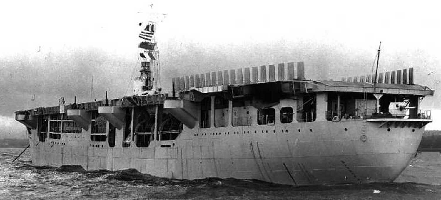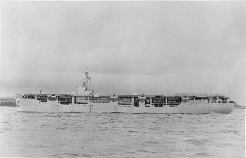 Najpierw jednak kilka słów o prawdziwym pierwowzorze. MV EmpireMacColl został zbudowany w 1943 r. przez stocznię Laird, Son& Co. W Birkenhead, na zamówienie Ministerstwa Transportu Wojennego. Początkowo budowano go, jako zbiornikowiec. W trakcie budowy podjęto decyzję o przebudowie go na lotniskowiec. Ostatecznie wszedł do służby jako statek MAC w listopadzie 1943 r. Pełnił służbę z mieszaną załogą, personel pokładowy i nawigacyjny pochodził z British Tanker Company, zaś cały personel lotniczy i obsługa uzbrojenia, z Royal Navy. Po zakończeniu działań wojennych statek ponownie poddano przebudowie. Po jej zakończeniu powrócił do roli zbiornikowca. Wrócił do służby w marynarce handlowej w 1946 r. Pełnił ją do 1962 r. kiedy to został wycofany z użytku i ostatecznie zezłomowany w Faslane. Jak widać na zamieszczonych powyżej zdjęciach archiwalnych, które zresztą stanowią prawie całą dokumentację fotograficzną tego okrętu, charakteryzował się on bardzo rasową, zgrabną sylwetką. Tylko osoby siedzące w temacie mogą od razu rozpoznać w nim cechy statku handlowego.