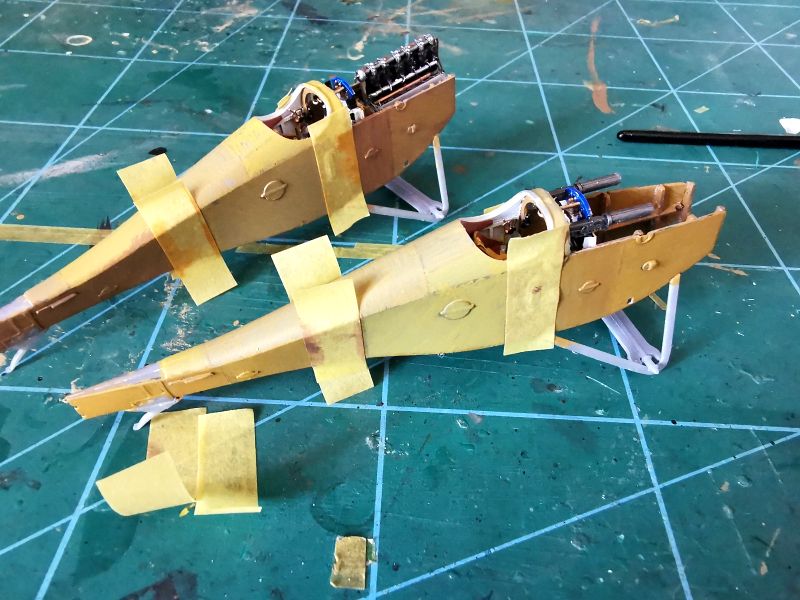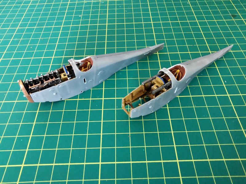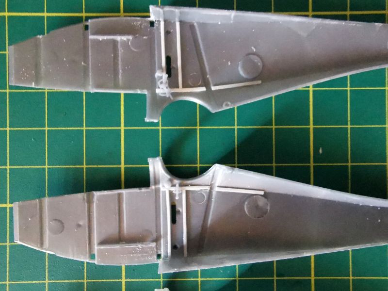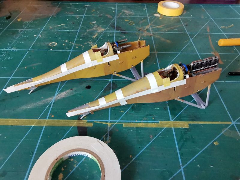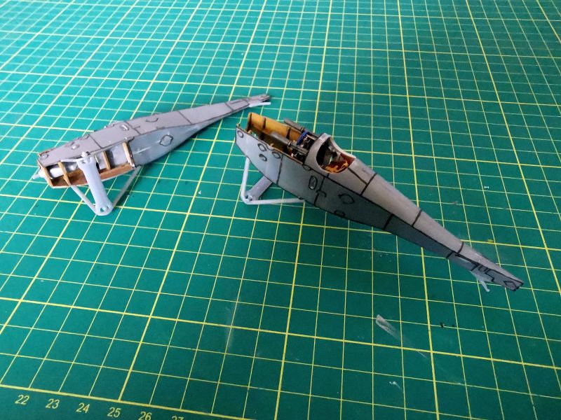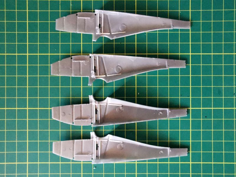 Podobnie jak ze sklejeniem kadłubów w całość. Jedyne miejsce na które trzeba uważać, to obszar pomiędzy komorą silnika a kabiną. Podejrzewam, że jest nieco zbyt szerokie w stosunku do wręgi, która jest pod spodem. W moich modelach odstaje nieco w jednym miejscu, na szczęście ledwie widocznym. Niemniej jednak warto poświęcić mu nieco uwagi. Okazało się także, że aby prawidłowo wmontować silnik w ramę nie należy wcześniej wklejać karabinów maszynowych. Ja swoje musiałem zdjęć i zamontować ponownie, już po wklejeniu silników.