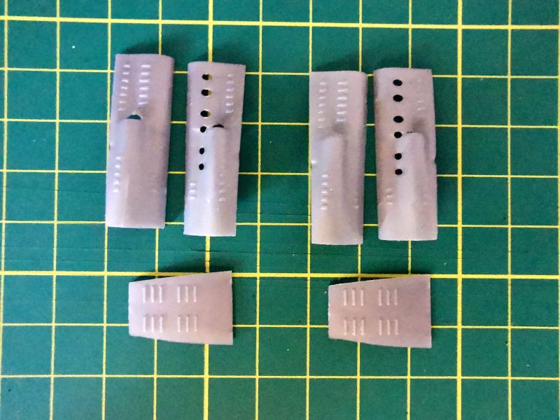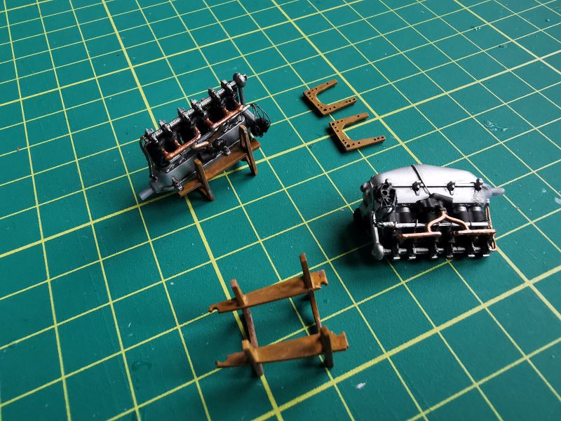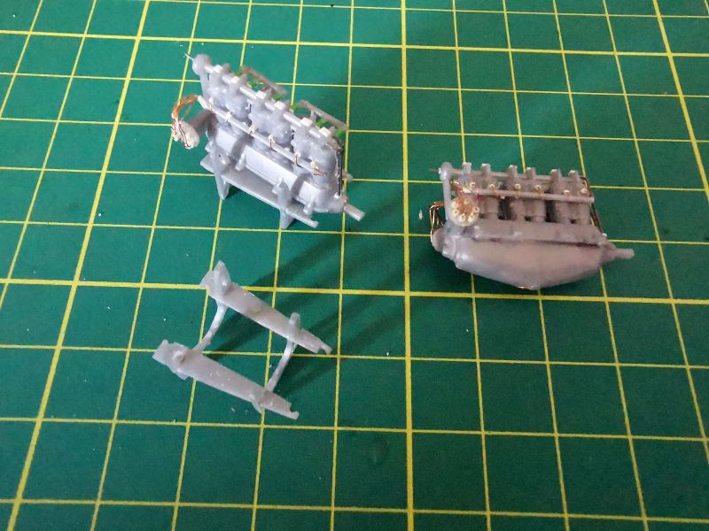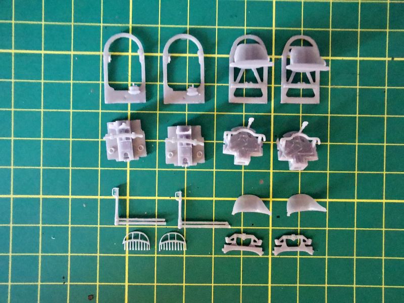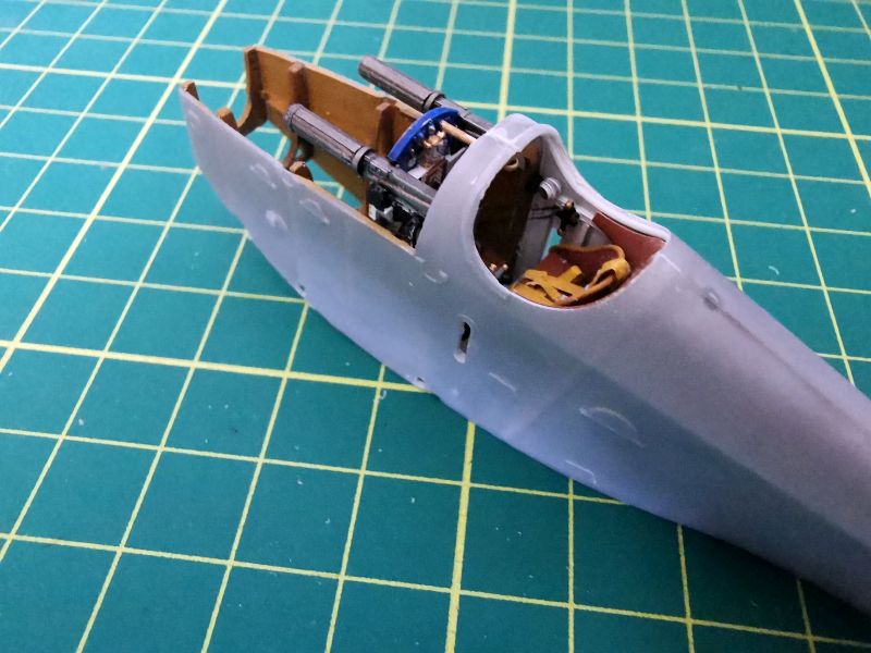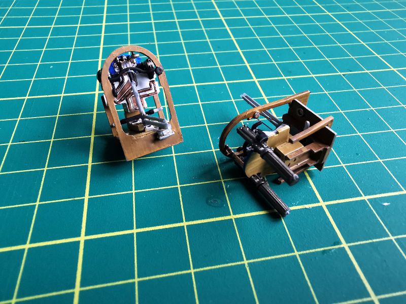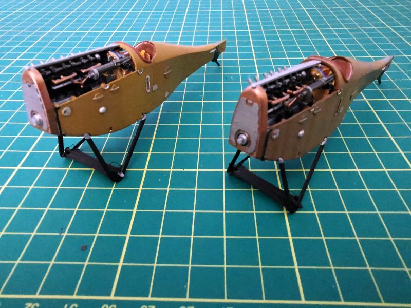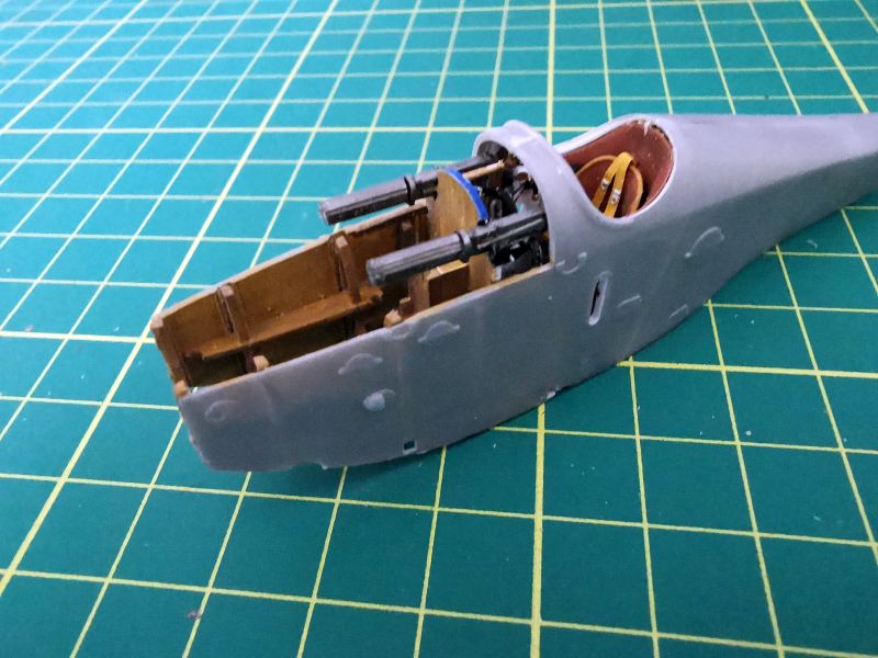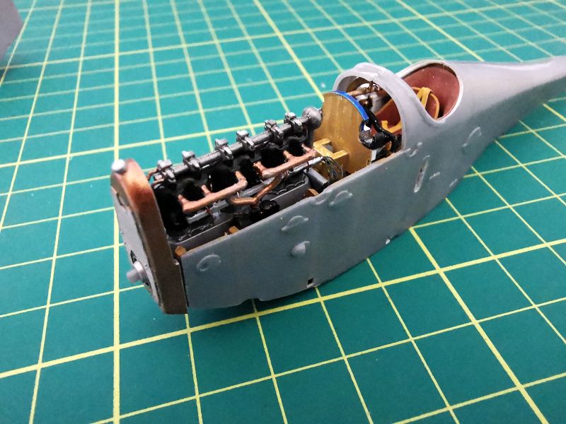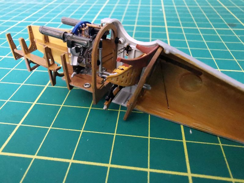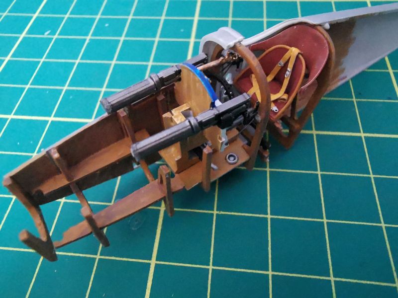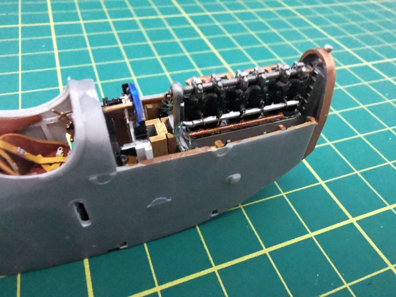 Przygotowałem także wszystkie detale wnętrza. Pokleiłem je w kilka modułów. Moja ingerencja nie była tu zbyt duża, ograniczała się do nawiercenia otworów w kilku wręgach, doklejenia chłodnic do drukowanych tylców karabinów, wykonanie wewnętrznych żaluzji chłodnicy oraz dołożenia detali do makiety silnika. Tu posiłkowałem się dokumentacją fotograficzną. Jeżeli zamierzamy przykleić na stałe obie blaszane osłony silnika, to całą tą zabawę można pominąć, nic nie będzie widać. Jeżeli natomiast pokrywy w naszym modelu mają być zdjęte, to konieczne jest detalowanie tego miejsca, bo sporo będzie widać. Trzeba też uważać na wzajemne spasowanie z sobą poszczególnych elementów, zwłaszcza lewego karabinu maszynowego z przewodami silnikowymi, ja je zrobiłem nieco zbyt szerokie i później karabiny nie chciały trzymać linii.