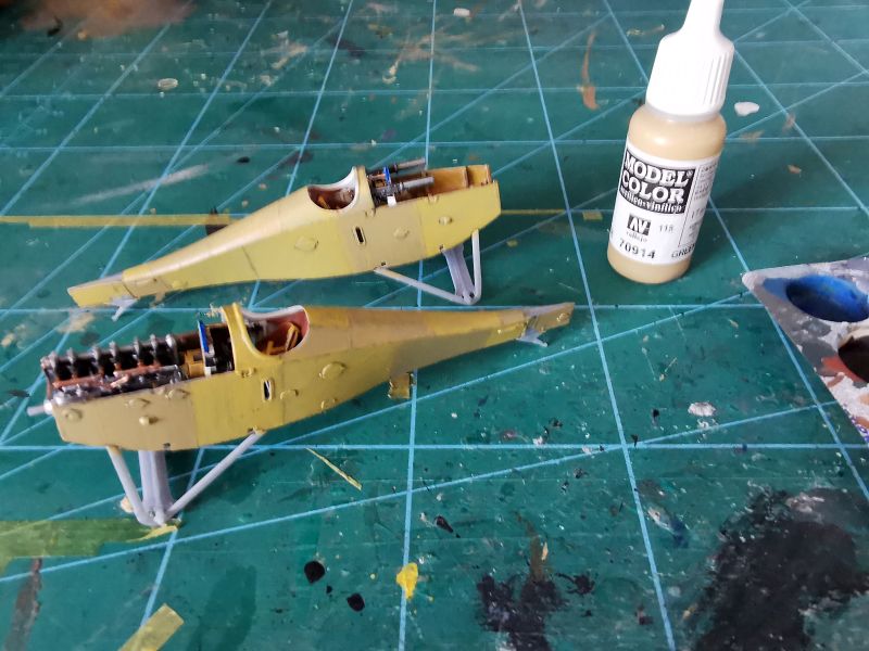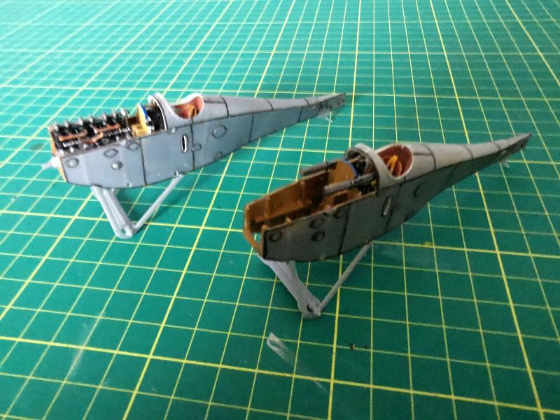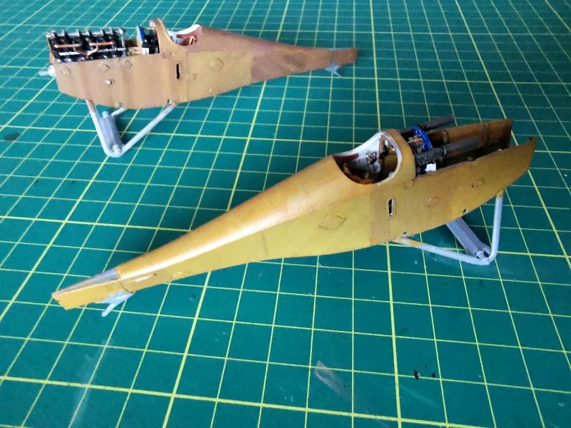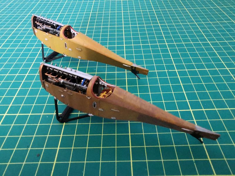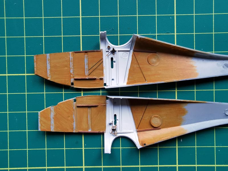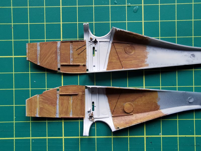 Można było zabrać się za malowanie wnętrza obu kadłubów. Zacząłem od pokrycia byłym kolorem kabin pilota w obu modelach. Lakier Bilmodel trafił do aerografu a z niego na odpowiednie elementy modeli. Potem była już praca z imitacją sklejki. Do tego używałem farb akrylowych nakładanych pędzlem. Najpierw beż, a potem brąz, przy czym w każdym z modeli był inny odcień. Jak widać na zdjęciach każdy panel malowałem w inną stronę, starając się, aby ślady po pędzlu pozostawiały charakterystyczny rysunek w postaci linii słoi, a beżowy przebijał spod brązowego, jak na prawdziwej sklejce. Na końcu dołożyłem kilka naciągów i cięgien sterujących.