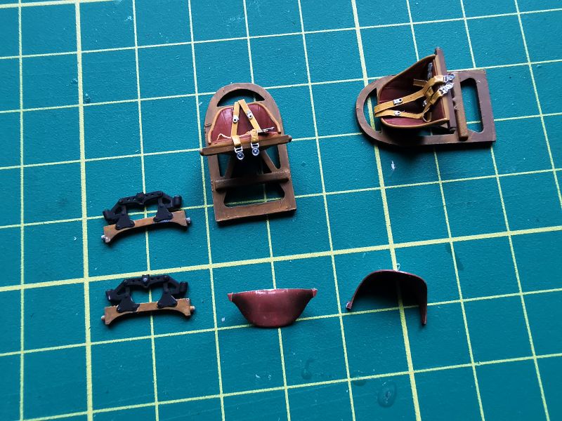 Malowanie pozostałych podzespołów wnętrza przebiegało w podobny sposób, z tym że większa część detali była malowana innymi kolorami. Roboty zatem było więcej. Od siebie dołożyłem pasy w fotelu pilota, w zestawie tego elementu niestety zabrakło, a szkoda. Swoje wykonałem od podstaw z kawałka zwykłego papieru pomalowanego na beżowo i następnie pociętego w paski. Paski te układałem na fotelach i przyklejałem w odpowiednich miejscach. Wszystkie klamry i sprzączki to fot otrawiony złom z mikromodeli okrętów w skali 1/700. Nadają się do tego idealnie. Tutaj pojawiło się jedno z odstępstw, o których wspominałem. Skurzane obicia foteli uzyskały nieco bardziej jaskrawy kolor, bardziej czerwony niż brązowy. Samoloty te przyleciały w Włoch, a jak chciałem im nadać odrobinę włoskiego sznytu, takiego designu rodem z Masserati czy Bugatti. Zależało mi, żeby modele miały nieco bardziej luksusowy wygląd. Chciałem też zwrócić uwagę na miedziane wykończenie niektórych detali, takich jak zbiorniki paliwa czy obudowy chłodnic. To nic innego jak akrylowa farbka Vallejo nowej generacji. Naniesiona zresztą pędzlem na elementy pomalowane uprzednio srebrnym metalizerem, przy odpowiednim rozcieńczeniu można uzyskać naprawdę wspaniałe efekty.
