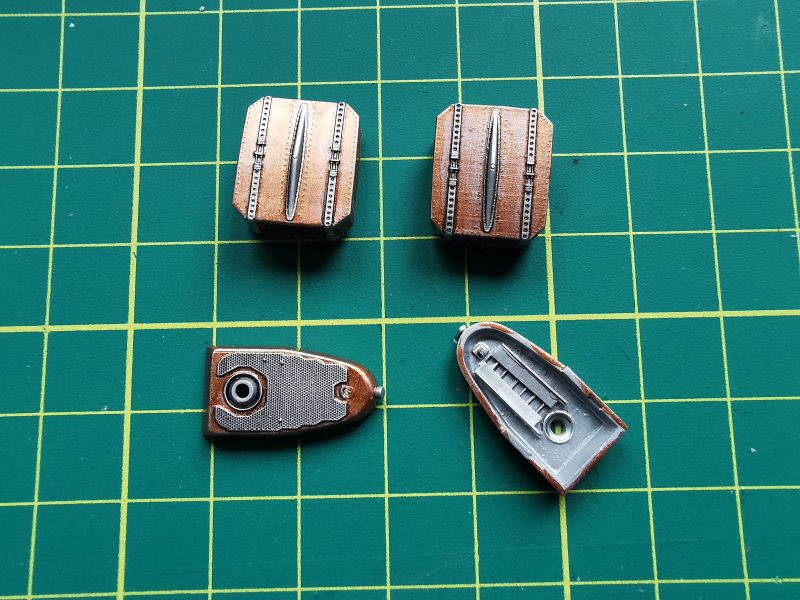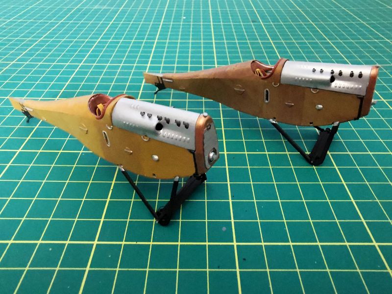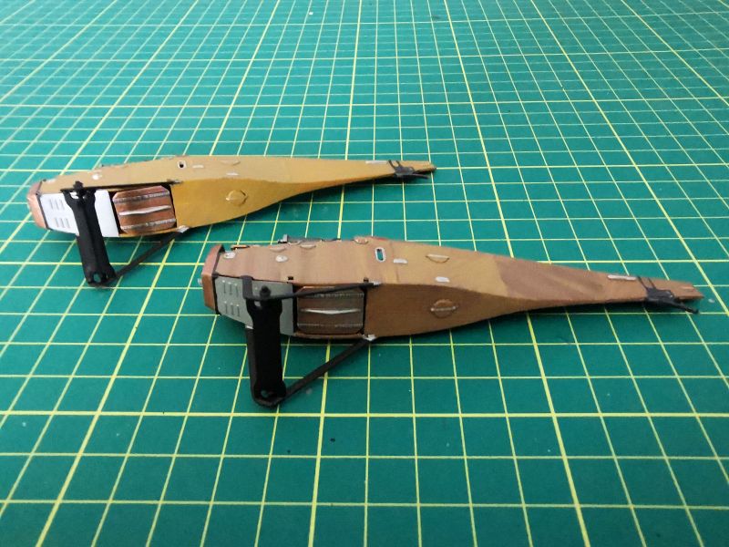 Na samym końcu wkleiłem i pomalowałem okucia zastrzałów. To bardzo ważne czynność, detale w postaci misternych wydruków mają zupełnie inne kształty, nie ma wśród nich elementów bliźniaczych, więc nie można pozwolić sobie na pomyłkę. Przez cały czas pracujemy z instrukcją i rozpiską poszczególnych elementów, ale warto. Te detale robią robotę. Przyklejamy je dokładnie według instrukcji, bez żadnych odstępstw.