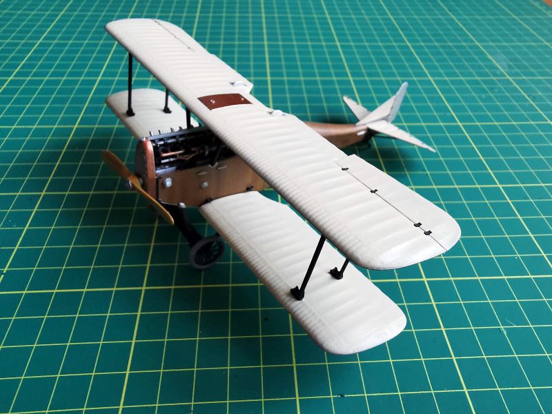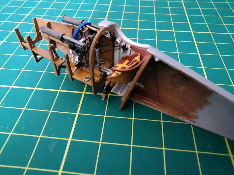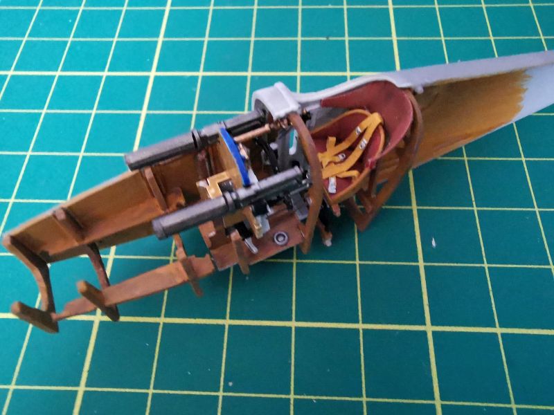 Ta praca polegała na wymalowaniu odpowiednimi kolorami wszystkich elementów wykonanych w oryginale z metali, skóry i innych niż drewno materiałów. Posiłkując się zdjęciami oryginałów dorobiłem kilka drobiazgów takich jak okucia przy chłodnicy, trochę bajerów przy płozach i podwoziu. Na samym końcu zamontowałem w kadłubie wszystko, co było do tej pory osobno. Wtedy nastąpiła gimnastyka z lewo burtowym karabinem maszynowym, udało mi się jednak ogarnąć i to. Nie przyklejałem na stałe lewej pokrywy silnika. Uznałem, że za bardzo napracowałem się nad wnętrznościami, żeby je teraz zakrywać.