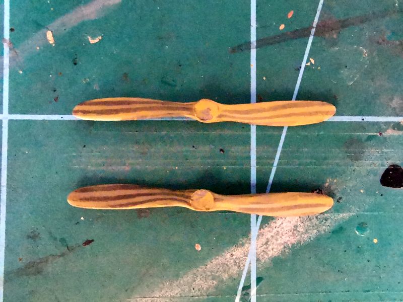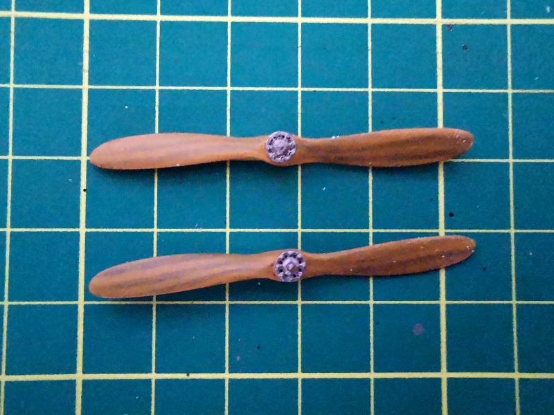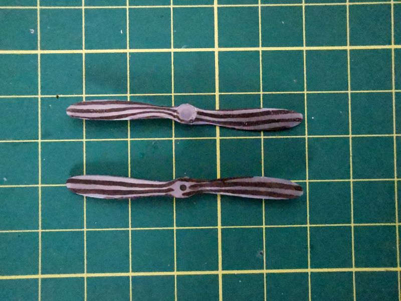 Malowanie śmigieł zacząłem od wymalowania na ciemnobrązowo imitacji ciemniejszych warstw drewna, ich układ starałem się odtworzyć na podstawie zdjęć. Potem cienka warstwa beżu, potem jasnego grązu, tak żeby poprzednie warstwy były widoczne. Na sam koniec piękna drukowana piasta i można było montować w modelu. Ale to później. Swoja drogą podziwiam tych, którzy śmigła wykonują samodzielnie z drewna czy forniru. Moje umiejętności w chwili obecnej to przekracza i pozostaje przy malowaniu.