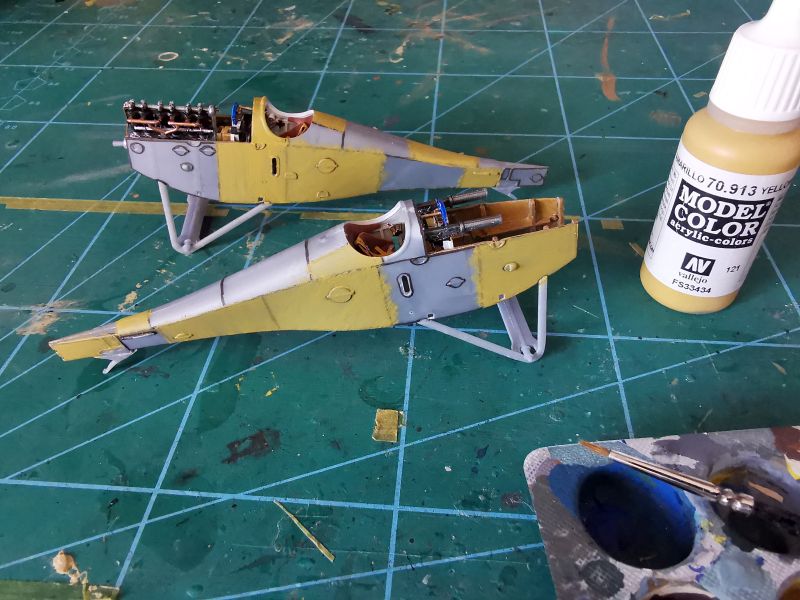 Mając gotowe oba kadłuby, obrobione miejsca łączenia ich połówek dokleiłem połozy i podwozia. Mogłem się zabrać za malowanie. Zupełnie błędnie założyłem, że skoro maluje pędzlami i farbami akrylowymi, to podkład nie będzie mi potrzebny. Okazało się, że farba akrylowa położona bezpośrednio na tworzywo, ma po wyschnięciu tendencję do ścierania się i odpryskiwania. Także podkład musi być, a ja musiałem na te kadłuby mocno uważać podczas dalszych prac. Zacząłem od wykonania swoistego pereshadingu, polegającego na wymalowaniu cienkim pędzlem linii styku poszczególnych arkuszy sklejki użytej do pokrycia kadłuba. Użyłem do tego ciemnobrązowej akrylowej farbki. W ten sposób zaakcentowałem także wszystkie panele i szczegóły konstrukcji obu kadłubów. Miejsc styku arkuszy sklejki nie nacinałem.