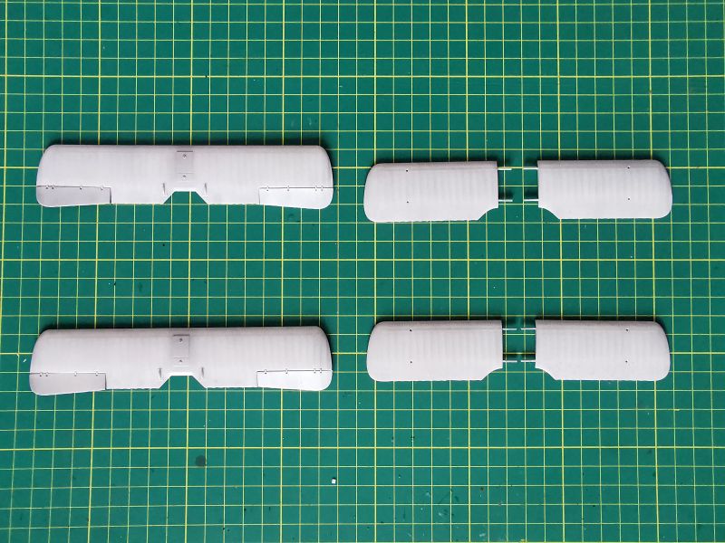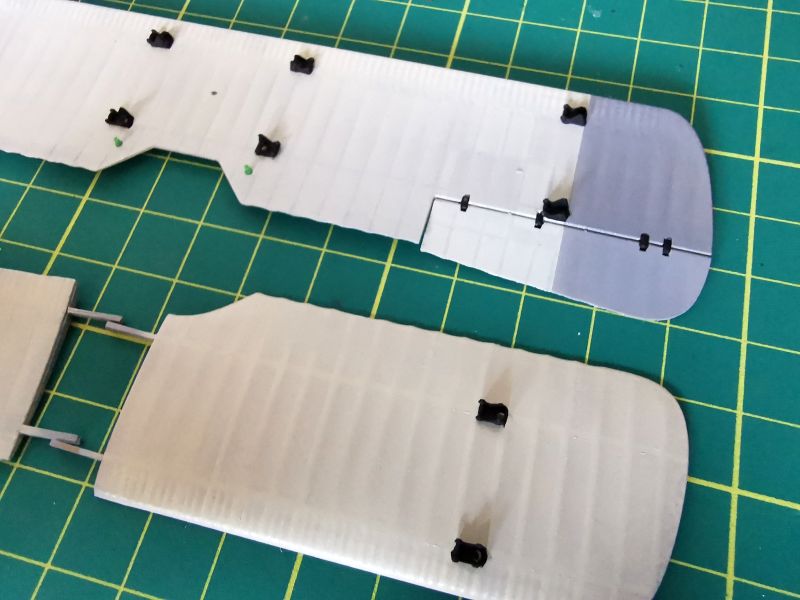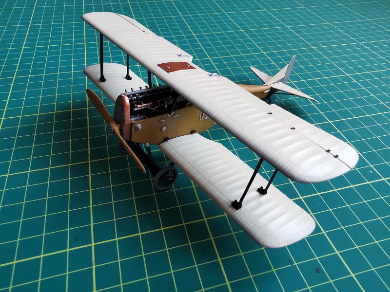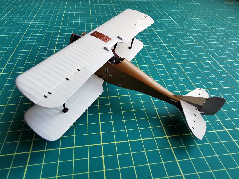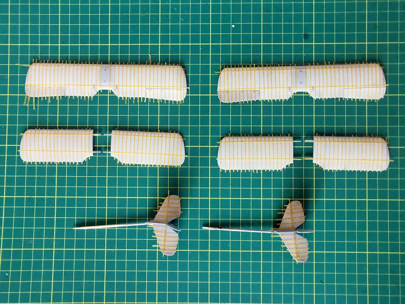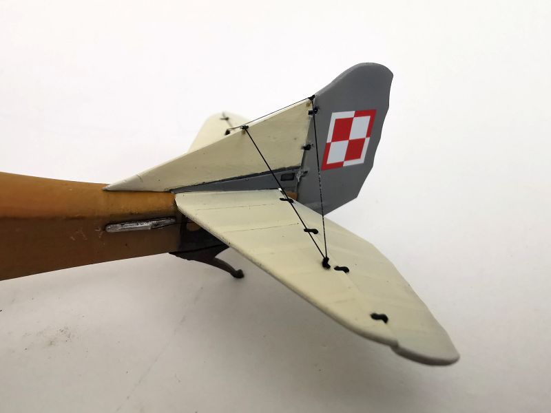 Malując skrzydła i usterzenia chciałem przetestować kilka technik podpatrzonych w internecie i kolegów. Samoloty, których modele budowałem miały płaty i usterzenia w barwie cellonowanego płótna na którym wymalowano znaki przynależności państwowej, numery lub inne oznaczenia. Powszechnie wiadomo, że konstrukcja skrzydeł i to co jest wymalowane na górnych powierzchniach prześwituje przez płótno i jest widoczna od dołu. Taki efekt chciałem uzyskać. Zacząłem od pokrycia skrzydeł podkładem i pomalowania na biało górnych powierzchni skrzydeł i usterzenia. Farbę nanosiłem niezbyt regularnie, tak jak przebiegały linie dźwigarów i żeber.