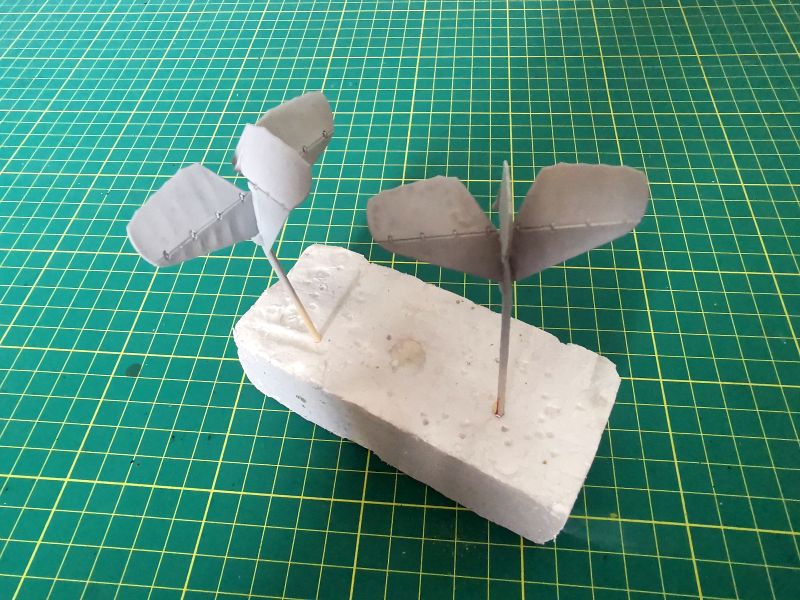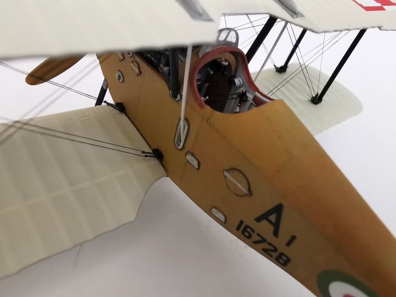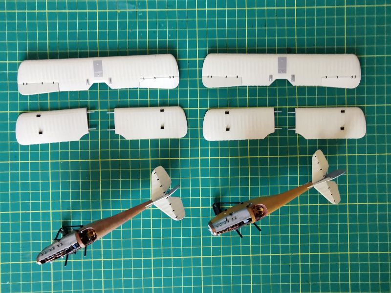 Mogłem teraz przystąpić do składania obu modeli w całość. W przypadku wielopłatów jest to jedna najbardziej newralgicznych czynności podczas całej budowy, rzutuje na ostateczny wygląd budowanego modelu. Samoloty Ansaldo A.1 Balilla nie miały zbyt skomplikowanej konstrukcji komory płatów, ograniczała się ona do czterech wsporników baldachimu górnego płata oraz dwóch par zastrzałów usytuowanych w pobliżu końcówek płatów. Montaż nie był zatem zbyt skomplikowany, pod warunkiem przestrzegania kilku zasad. Po pierwsze po wklejeniu dolnych płatów w kadłuby i doklejeniu wsporników baldachimu, model warto odstawić na dłuższy czas (najlepiej na noc) aby klej dobrze związał. Niezależnie od tego, czy używamy kleju do polistyrenu czy cyjanoakrylowego. Zastrzały najlepiej od razu wkleić pod odpowiednim kątem. W naszym przypadku niewielkiej korekty wymagało miejsce styku wspornika z kadłubem. Potem możemy wkleić zastrzały w swoje miejsca w górnym płacie i znowu odstawić model, by klej związał. Kiedy jesteśmy pewni, że wszystko dobrze się trzyma a model ma prawidłową geometrię, wklejamy zastrzały zewnętrzne. W przypadku tego modelu zastrzały miały idealną długość, nie trzeba było nic poprawiać. Wkleić, pomalować i gotowe. Oba modele były w jednym kawałku. Dokleiłem także uprzednio pomalowane koła. Tu także dopuściłem się drobnego odstępstwa, montując koła szprychowane, podczas gdy na większości zdjęć polskie Balille miły pokrowce na kołach. Pokrowce były z płótna i można było je zdjąć, a ja nie mogłem się oprzeć tym pięknym i misternym wydrukom.