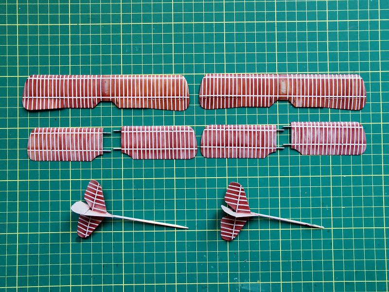 Pomalowane kadłuby przedstawiały się tak, jak widać na zdjęciach. Oczywiście można było uprościć sobie prace i użyć kalkomanii imitujących sklejkę, ale ja chciałem przypomnieć sobie stosowane kiedyś metody i nieco je zmodyfikować, co zresztą mi się udało. Początkowo chciałem też pobawić się z kredkami akrylowymi, ale po kilku próbach z których nie byłem zadowolony, zarzuciłem ten pomysł. Miałam dwa kadłuby pomalowane w dwóch różnych odcieniach. Z obu byłem zadowolony, mogłem pracować dalej.