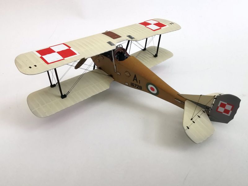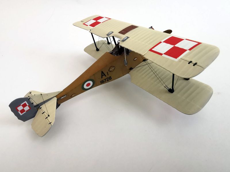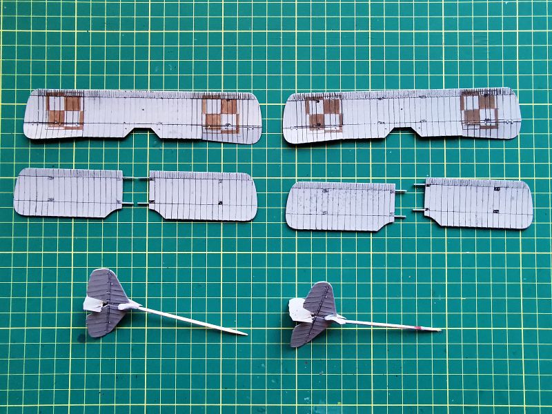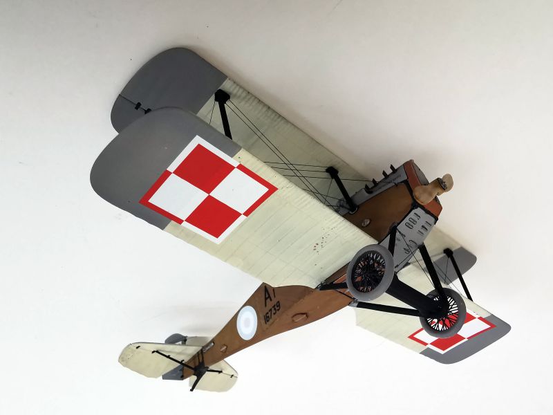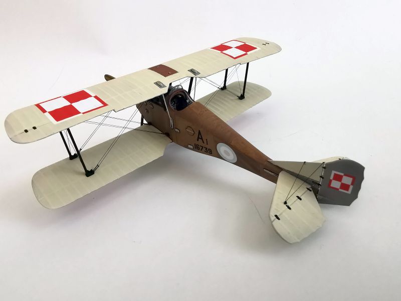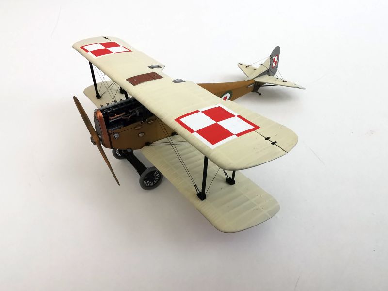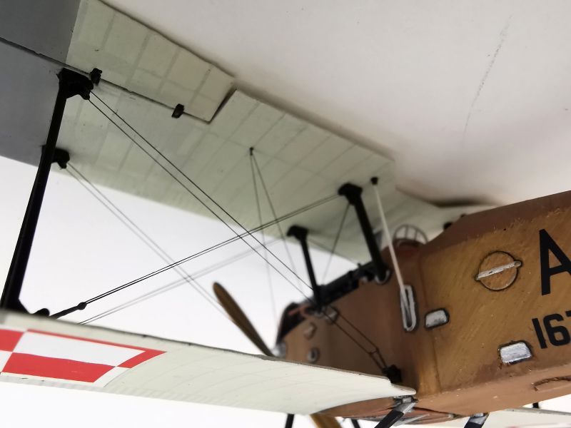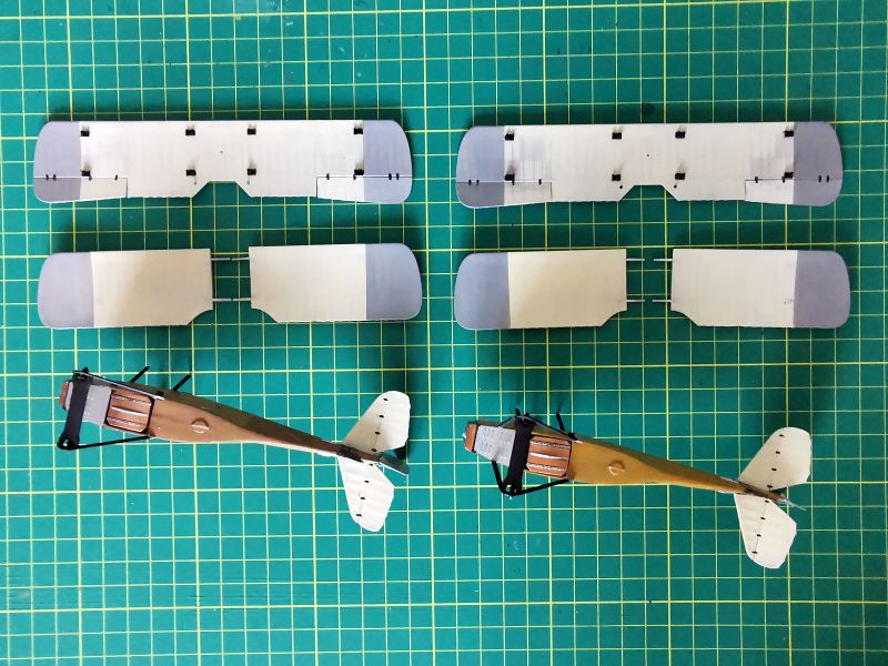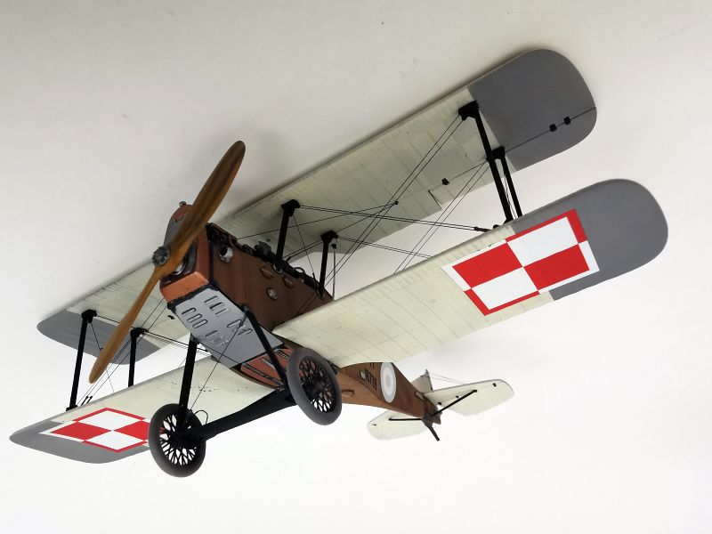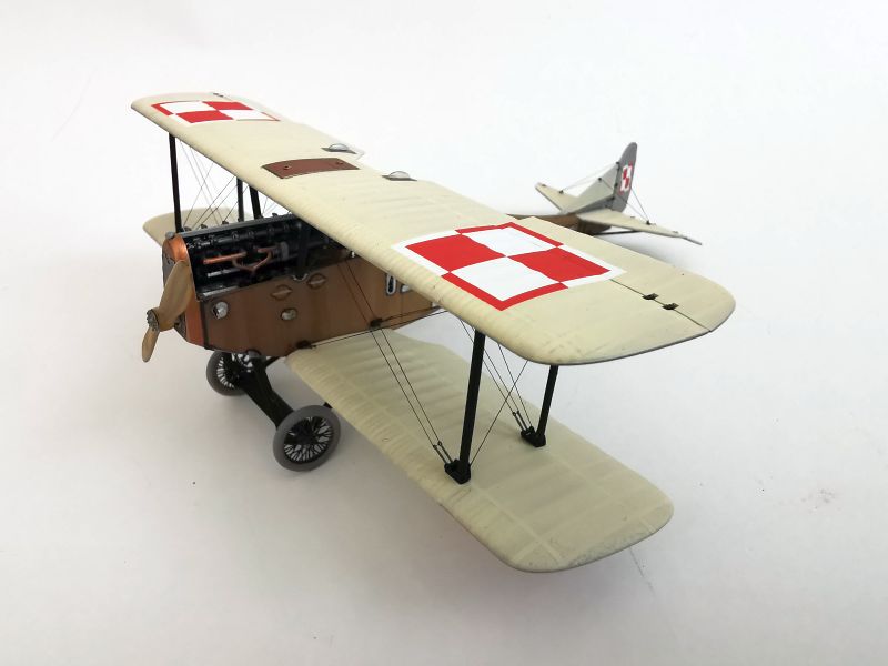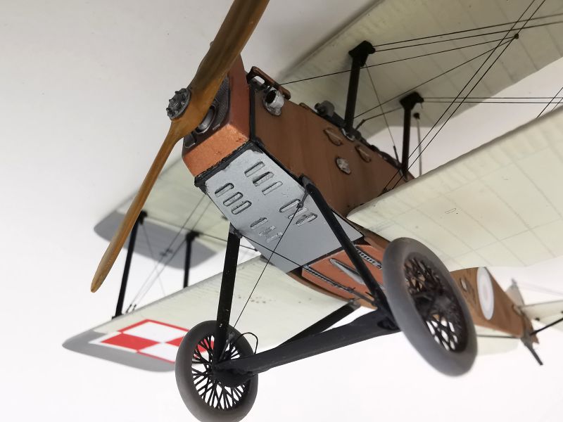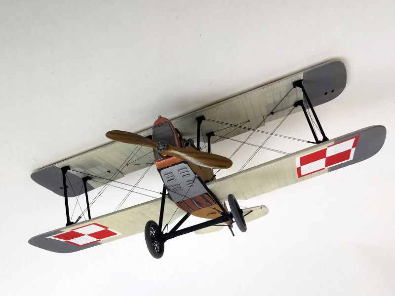 Mając modele sklejone w całość, mogłem przystąpić w sumie do najbardziej przyjemnego etapu budowy obu modeli, czyli detalowania, nakładania kalkomanii, werniksowania i temu podobnych czynności. Zacząłem od rozpięcia naciągów. Tradycyjnie do tego celu użyłem gumonitki AK, którą uzupełniłem śrubami rzymskimi Gaspatcha. Nie popełniłem jednak takiego błędy jak w przypadku Breguetów. Śruby wkleiłem jedynie na okuciach dolnego płata. Pozwoliłem sobie na jeszcze jedno małe odstępstwo. Pominąłem płócienne otuliny, w których były podwójne naciągi. To także można było zdjąć, a ja nie miałem pomysłu, jak je poprawnie wykonać, żeby wyglądało wiernie a nie komicznie i nie szpeciło modeli. Ostatecznie zgodnie z instrukcją rozpiąłem w komorze płatów jedynie podwójne naciągi. Kalkomanie nałożyłem oczywiście po zagruntowaniu obu modeli Sidoluxem. Położyły się bez najmniejszych problemów, zaś po nałożeniu werniksu nie srebrzyły się. Na samym końcu przykurzyłem oba modele suchymi pigmentami. Miejsca standardowe. W przypadku wydechów były to pigmenty rdzawe i czarne, zaś w przypadku kół i płozy ogonowej ziemisty. Na samym końcu przykleiłem śmigła i wiatrochrony, modele były gotowe.