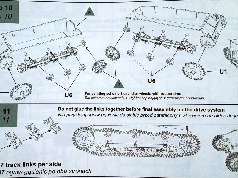 Jakie zaś są różnice? Jest to ramka oznaczona jako „Z”. Znajdziemy na niej elementy kół napędowych, i trzeba od razu zaznaczyć, że są to elementy alternatywne, o czym świadczą rysunki montażowe, ukazujące sposób wykorzystania zawartości wypraski. Przy okazji dowiadujemy się, jak wygląda instrukcja.
