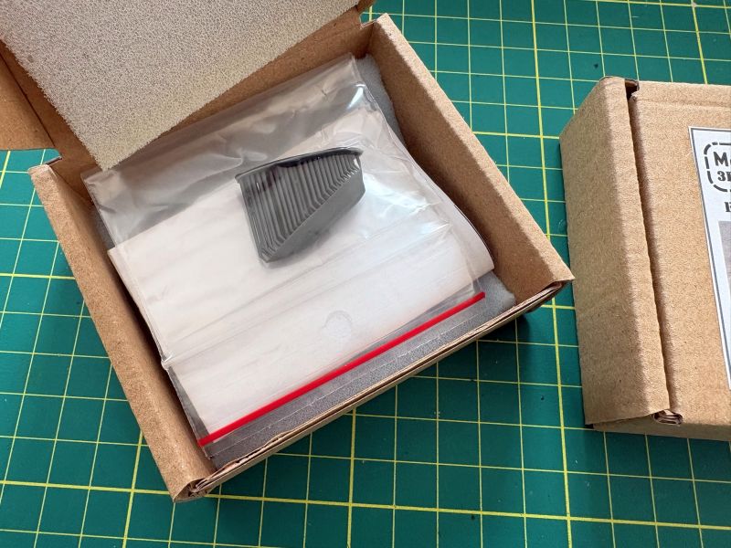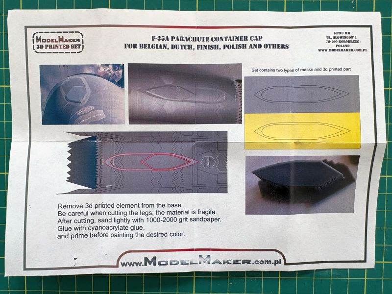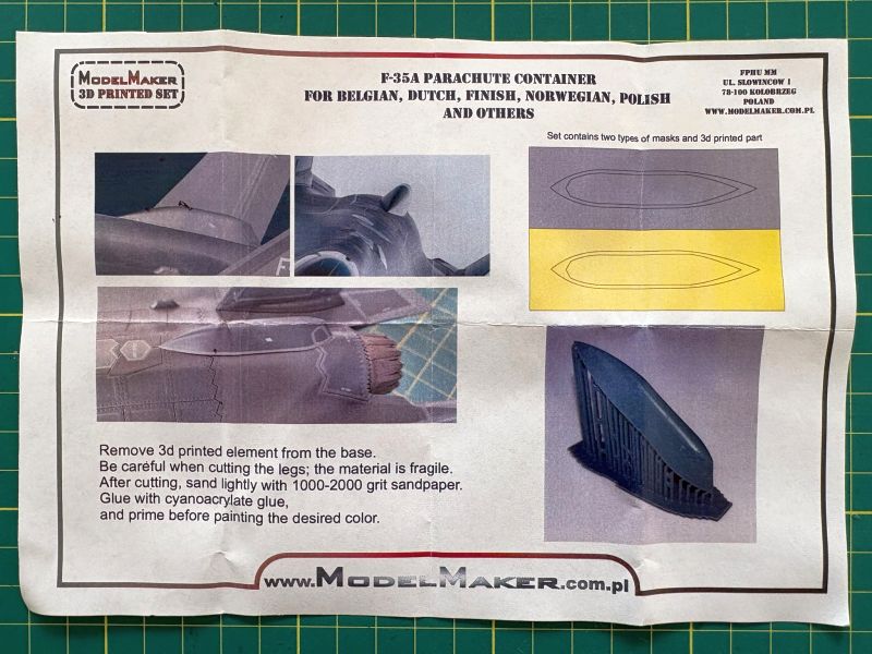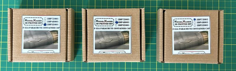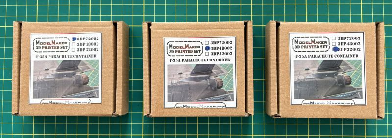 Ponieważ są one konieczne do poprawnego wykonania modelu F-35A nie tylko w barwach polskich, ale także w przypadku większości użytkowników europejskich. Ten element wyposażenia niestety został pominięty w większości zestawów dostępnych na rynku. Zasobniki na spadochron hamujący mają jedynie zestawy Tamiyi w skali 1/48 oraz Revella w skali 1/72. Zaślepki nie ma natomiast żaden z dostępnych na rynku zestawów. ModelMaker przygotował oba typy akcesoriów. Są one pakowane w niewielkie kartonowe pudełka, zaś ich zawartość jest solidnie zabezpieczona kawałkami odpowiednio przyciętej gąbki.