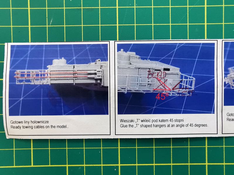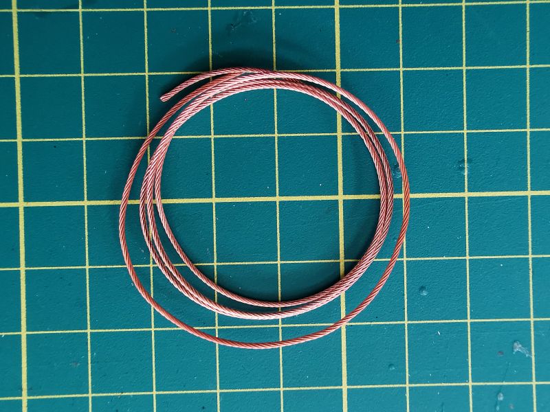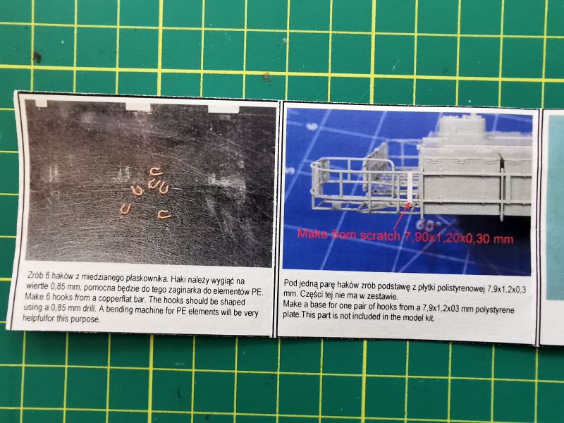 Do tego dochodzi kawałek plecionej metalowej linki, z której wykonamy liny holownicze, doklejając do nich żywiczne końcówki. Z kawałka cienkiego drutu wykonamy stopnie wejściowe, zaś z miedzianego płaskownika haki, które zamontujemy na koszu wierzy i dopiero na nich osadzimy liny.