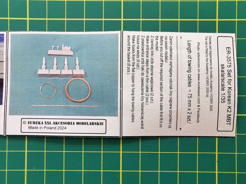 Zestaw akcesoriów składa się tradycyjnie z lin holowniczych, ale także kilku innych detali, które pozwolą nam nadać życia budowanej replice czołgu. Przewidziany jest on do wersji używanej w Polsce, a dedykowany jest do modelu firmy Academy, lub jej polskiego wydania, czyli Hobby 2000. Zapakowany jest on e estetyczny blisterk z kolorową ulotką. Produkty Eureka XXL zawsze cechowała duża estetyka wydania.