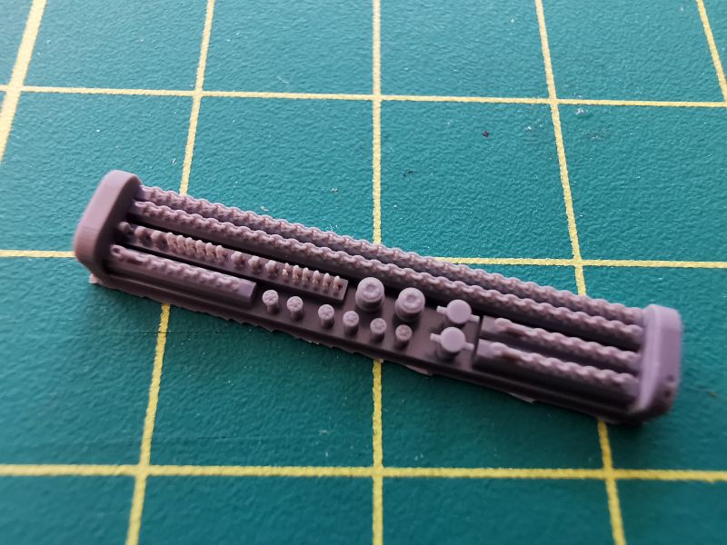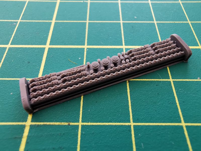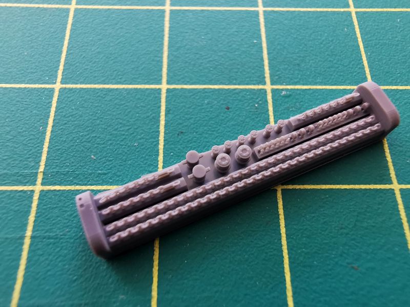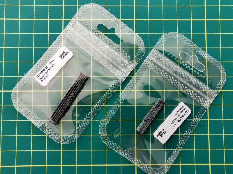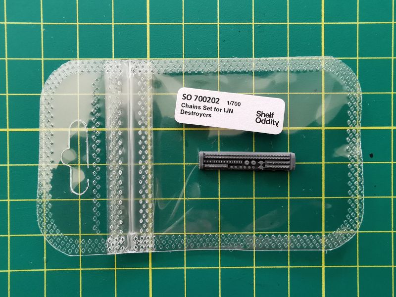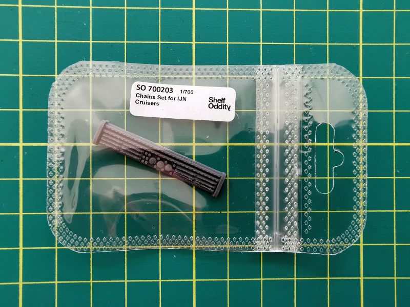 W środku znajduje się pojedynczy wydruk z ciemno szarej żywicy, zaś na nim znajdują się tytułowe łańcuchy, dwa odcinki o długości 3,5 cm oraz cały osprzęt w postaci kabestanów, zawiesi łańcuchowych czy krętlików. Jednym słowem wszystko, czego potrzebujemy do prawidłowego pokazania w modelu tych istotnych przecież detali. Wszystko wykonane z bardzo wielką dbałością o zgodność z oryginałem i detale. Ogniwka łańcuchów mają poprzeczki, zaś według zapewnień producenta po odcięciu od wydruku, łańcuch powinien pracować, mieć możliwość dowolnego ułożenia na pokładzie. Ponieważ mam w zbiorach kilka zestawów do budowy modeli japońskich krążowników i to wydawanych w różnych latach, porównałem to, co oferował producent, w moim wypadku Fujimi, do nowych akcesoriów Shlef Oddity. Jeżeli dysponujemy zestawami starszymi, takimi jak model krążownika „Ashigara” to można tu mówić wręcz o konieczności wymiany łańcuchów. Zestawy wyprodukowane później, jak na przykład modele krążownika „Tone” mają osprzęt kotwiczny odwzorowany lepiej, ale zastosowanie łańcuchów z omawianego zestawu nie zaszkodzi. Nie wymagają natomiast w mojej ocenie takich zabiegów zestawy najnowsze, mam tu na myśli modele krążowników typu „Mogami”, gdzie osprzęt kotwiczny wystarczy umiejętnie pomalować i użyć wacha. Oczywiście, jeśli ktoś ma ochotę użyć opisywanych w tym miejscu akcesoriów, jak najbardziej może to zrobić.