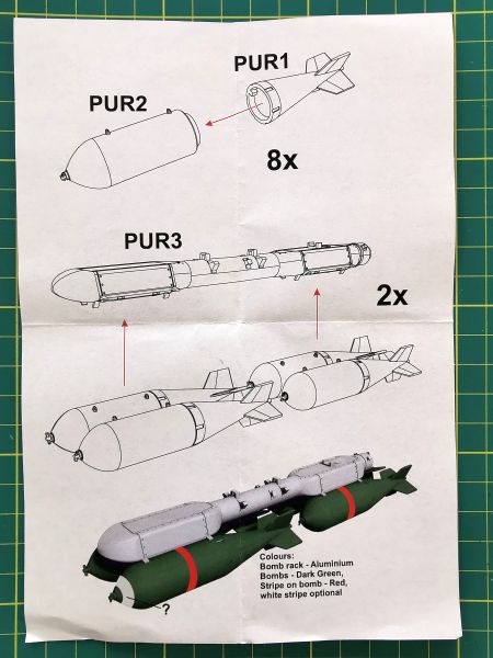 Jak to w prawidłowy sposób wykonać dowiemy się z ulotki będącej instrukcją montażu i malowania. Zestaw nie zawiera kalkomanii, jeżeli na podstawie posiadanej dokumentacji ustalimy, że na bombach i na belkach znajdowały się jakieś stencile, musimy je zorganizować we własnym zakresie, albo zamawiając w firmie drukującej kalkomanie na indywidualne zamówienie, lub dopasować z innego zestawu.