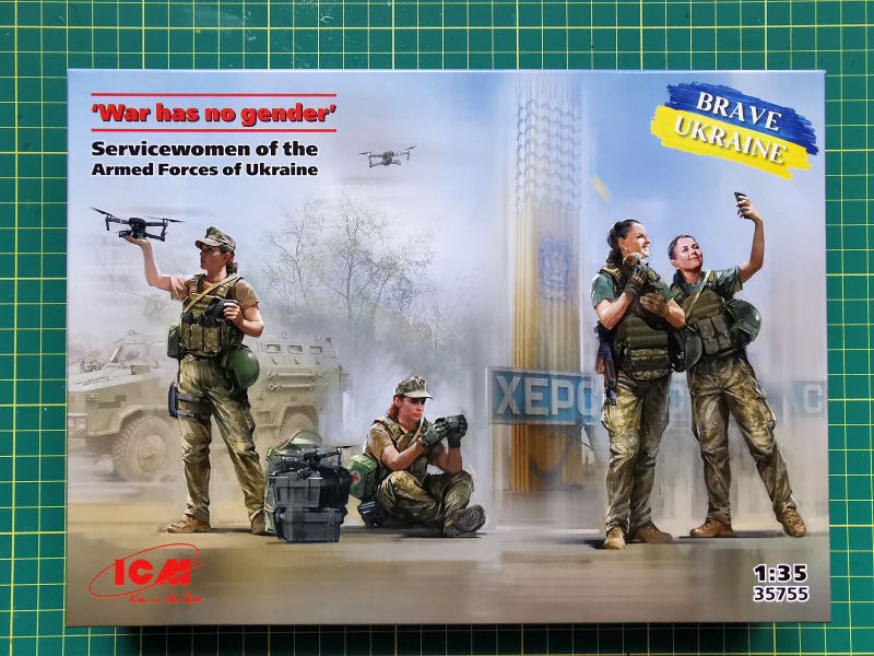 Pierwszy z zestawów, jakie chciałbym przedstawić nosi dość wymowny tytuł 'War Has No Gender' Servicewomen Of The Armed Forces Of Ukraine. Otrzymamy w nim figurki czterech Pań Żołnierek w pełnym oporządzeniu polowym. Dwie z nich zajmują się obsługą dronów, dwie pozostałe robią sobie selfie ze szczeniakiem. W mojej ocenie chciano tu pokazać, że pomimo swojej brutalności i bezwzględności współczesnego konfliktu zbrojnego znajdzie się jednak trochę miejsca na chwile ciepła, miłości i spokoju. To przynajmniej wywnioskowałem oglądając boxart pudełka, który ujął mnie do tego stopnia, że postanowiłem opisać cały zestaw. Warto także zwrócić uwagę na pojazd stojący na drugim planie.