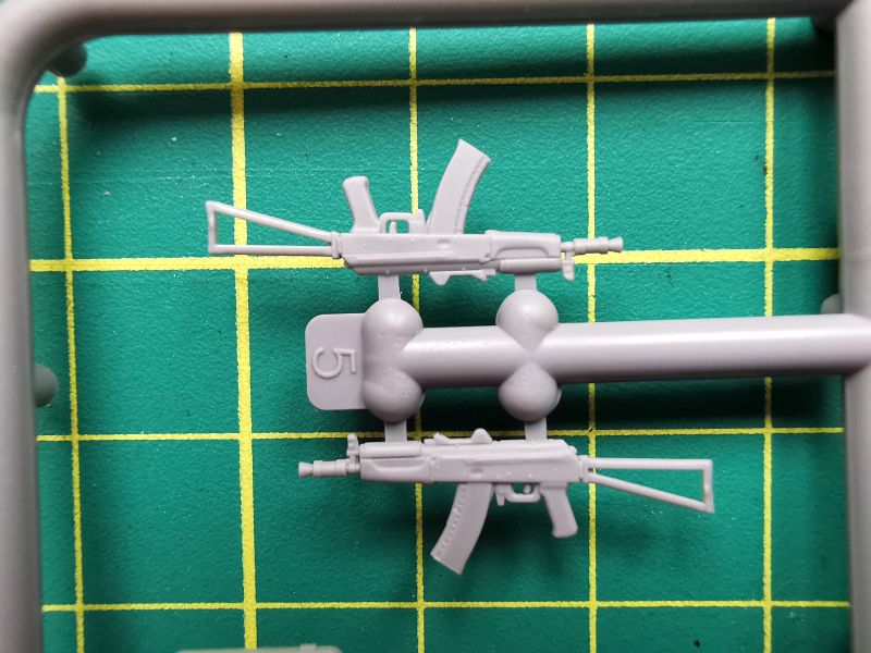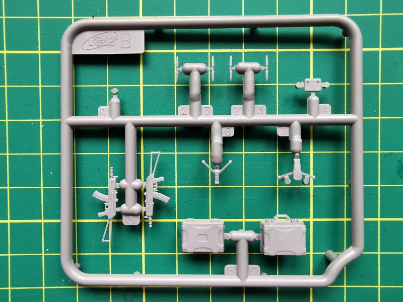 Dwie kolejne, mniejsze ramki zawierają drony wraz z case oraz uzbrojenie składające się z czterech karabinków, jakiejś nie wiem jakiej krótkiej wersji Ak-74. Podobnie jak w przypadku opisanych powyżej, także te wypraski prezentują solidny, wysoki poziom z dobrze wykonanym detalem.