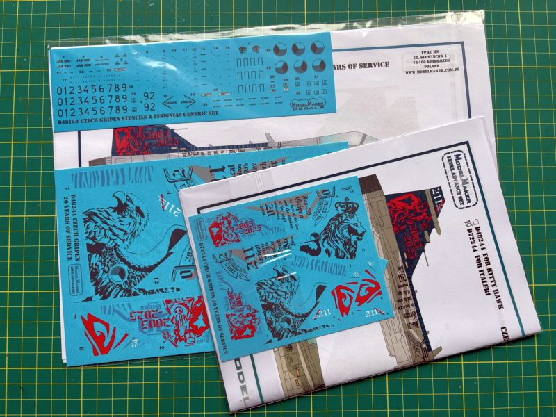 Firma ModelMaker od dawna specjalizuje się wydawaniu zestawów kalkomanii ze okolicznościowymi malowaniami współczesnych samolotów wojskowych. Jej ostatnią propozycją są zestawy do modeli samolotów wielozadaniowych JAS-39 Gripen. Pretekstem do ich wydania było oczywiście okolicznościowe malowanie jednego z nich. Konkretnie, jednego z czeskich, wykonane z okazji 20 lat służby w tamtejszym lotnictwie wojskowym. Kalkomanie przygotowano w podziałkach 1/72 oraz 1/48.