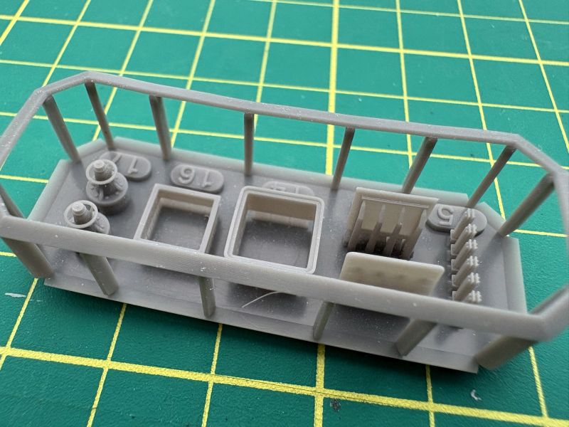 Kolejnym wydrukiem jest nadbudówka. Jest tu tylko jeden dość spory element. Tu także będzie trochę zabawy z odcinaniem suportów, trzeba także uważać na sporo drobnych detali umieszczonych na ściankach nadbudówki. Podobnie jak w przypadku dziobówki, wszystkie drzwi można wykonać w pozycji otwartej. Na bocznych ścinakach poza licznymi detalami jest widoczny delikatny raster, ale moim zdaniem nie będzie on widoczny po pomalowaniu, zwłaszcza jeśli zastosujemy podkład. Można też go delikatnie przeszlifować, znajdą się pewnie „prawdziwi modelarze” którzy szlifować nic nie będą, ale za to zrobią porządną dramę w internetach. Rastera to oczywiście nie zlikwiduje, ale jak ktoś nie umie inaczej, to nie mój problem. Dla mnie ważne jest co innego. Nadbudówka mam kompletne wyposażenie wnętrza. W górnej części z przodu mamy cos w rodzaju tablicy przyrządów z kołem sterowym.