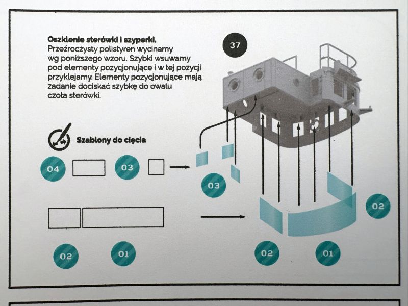 Pleksi do wykonania szyb zabezpieczono przed porysowaniem kawałkiem bibułki. Szablony do ich wycięcia, znajdziemy w instrukcji.