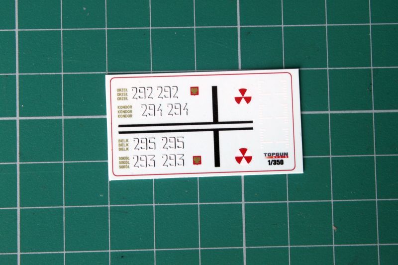 Do każdego z modeli producent dołączył arkusik kalkomanii z oznaczeniami dla wszystkich okrętów używanych w PMW. Mamy zatem numery taktyczne, nazwy, godła oraz wszystkie oznaczenia eksploatacyjne. Jakość druku kalkomanii także nie budzi wątpliwości, brakuje właściwie tylko bander, taka drobna uwaga na przyszłość.