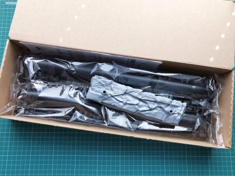 Istotnie tak też się stało. Model zapakowano w solidne kartonowe pudełko, z bardzo ładną okładką, czyli tak jak to od pewnego czasu praktykuje Zvezda. Na okładce widnieje nasza „bohatreka” wyruszająca z bazy na kolejny patrol, oraz informacje o modelu w językach rosyjskim i angielskim. Szata graficzna i boxart mogą się podobać lub nie, ale jedno co trzeba Rosjanom oddać, nie ma modeli lepiej zabezpieczonych przed uszkodzeniem ramek.
