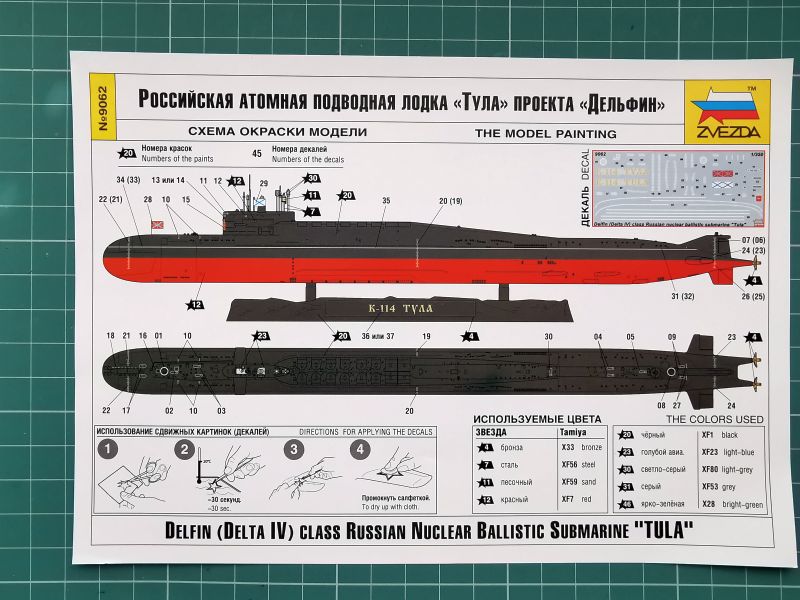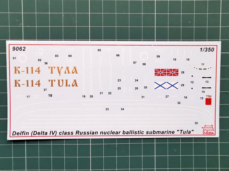 Dołączona do zestawu kalkomania umożliwia wykonanie modelu w jednym malowaniu, a mianowicie okrętu podwodnego K-19 „Tulia” wchodzącego w chwili obecnej w skład Floty Północnej Rosyjskiej Marynarki Wojennej. Producentem kalkomanii do modeli Zvezdy jest najprawdopodobniej firma Begemot, która już dawno utrwaliła sobie bardzo dobrą markę na rynku modelarskim. Arkusik kalkomanii jest dość spory i znajduje się na nim wszystko co jest konieczne, nie tylko nazwy, godła i bandery, ale także linia wodna, podziałki zanurzenia, oznaczenia włazów i temu podobne rzeczy. Jedyne czego moim zdaniem zabrakło, to oznaczenia dla okrętu jeszcze z okresu dawnego ZSRR, swój model mam zamiar wykonać właśnie z okresu „Polowania na Czerwony Październik”.