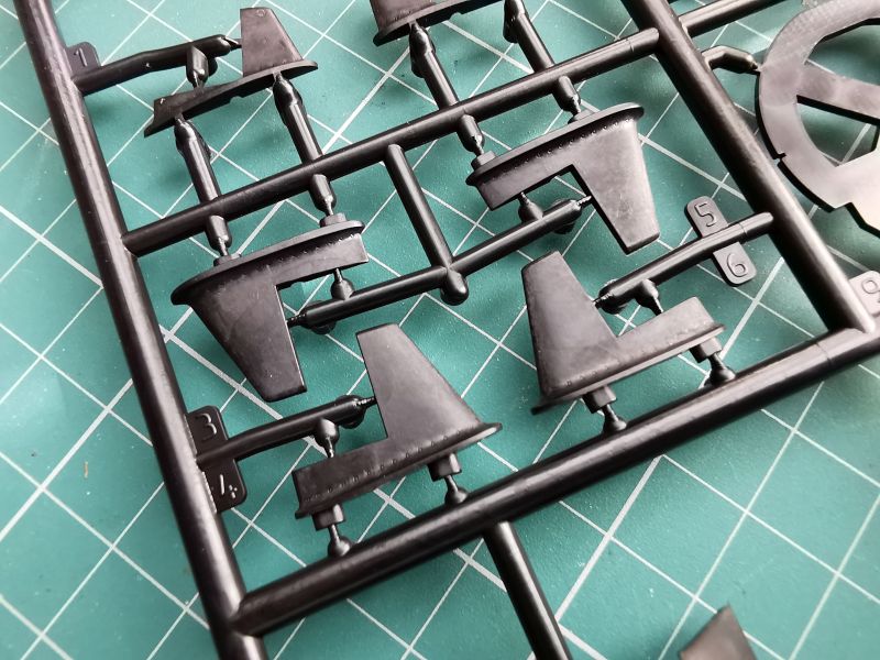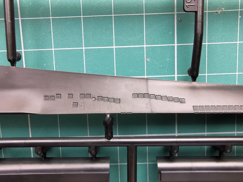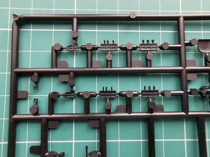 Czwarta ramka jest nieco mniejsza niż poprzednie, na niej producent umieścił porywy wszystkich luków, których dość sporą liczbę możemy wykonać w pozycji otwartej, wszystkie maszty i peryskopy a także dziobowe stery głębokości, które zamontujemy na kiosku. Stery oczywiście możemy zamontować w pozycji wychylonej, lub pozostawić je ruchome. Producent przewidział i taką ewentualność umieszczając w wewnętrznych ściankach połówek kiosku odpowiednie ograniczniki, dzięki czemu stery można ustawić tylko w takich położeniach jak w prawdziwym okręcie.