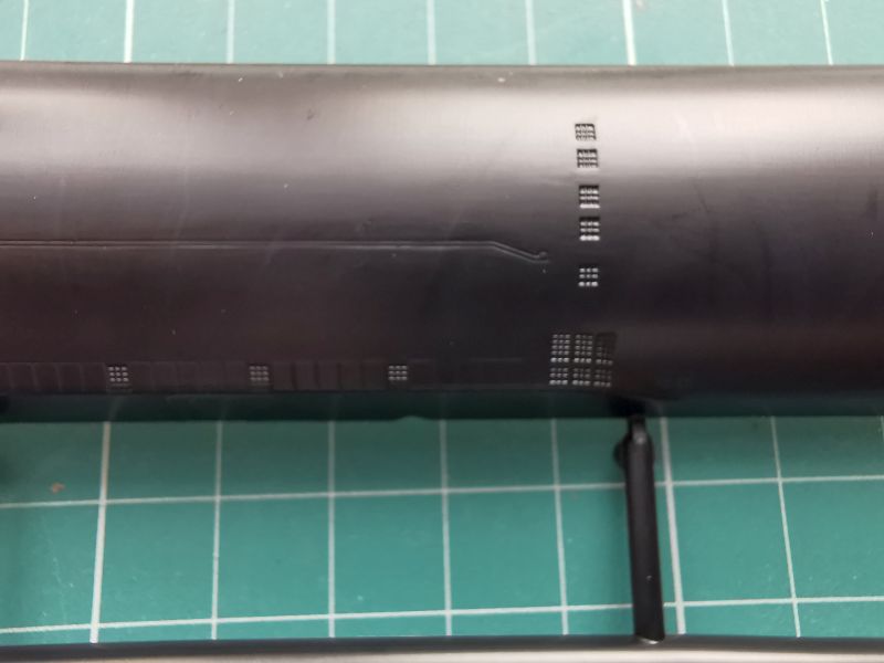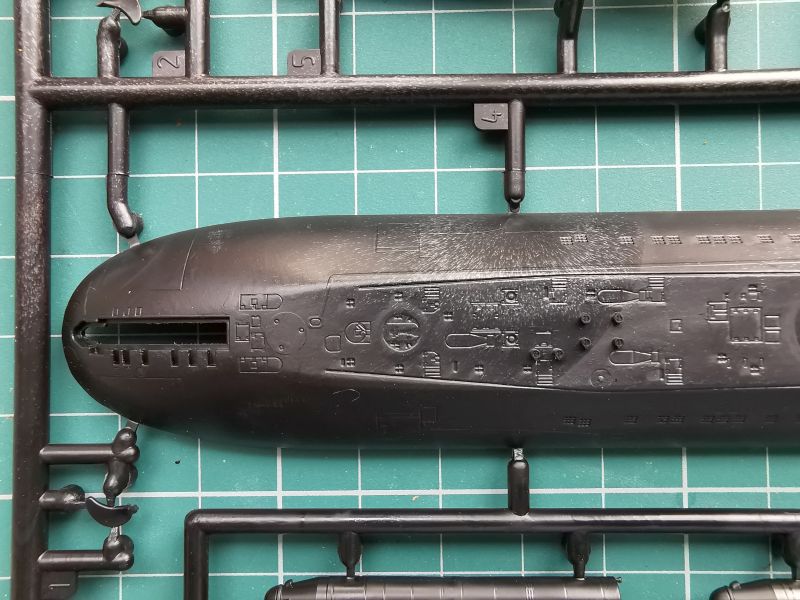Model opracowano z wielką dbałością o szczegóły, a ich wbrew pozorom jest tu sporo, o czym choćby świadczy kadłub. Nie jest to jak sądzą niektórzy tylko kawał rury z kijem od szczotki, ale przecież skomplikowana machina wojenna. Faktura pokładu jak widać pełna jest różnego rodzaju detali takich jak urządzenia cumownicze, włazy, a producent nie poszedł tu na łatwiznę. Podobnie ma się rzecz z powierzchnią kadłuba, gdzie jest całkiem spora liczba otworów przelewowych mających postać delikatnych kratek, co bardzo dobrze wykonano w podzespołach modelu. Pamiętać należy, że do kadłuba przykleimy czerpnie wody do układów chłodzenia reaktora i innych podzespołów okrętu.