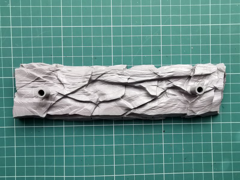 Do wszystkich swoich modeli okrętów Zvezda dołącza podstawkę wykonaną z szarego tworzywa imitującą… no właśnie nie wiadomo co, fale? Dno morskie? Na to pytanie nie ma jednoznacznej odpowiedzi. Można oczywiście ustawić na niej model, ale ja osobiście, kiedy kleję model z pełnym kadłubem, wolę go umieścić na klasycznym rozwiązaniu, czyli ładnie wyfrezowanej deseczce z mosiężnymi bolcami.