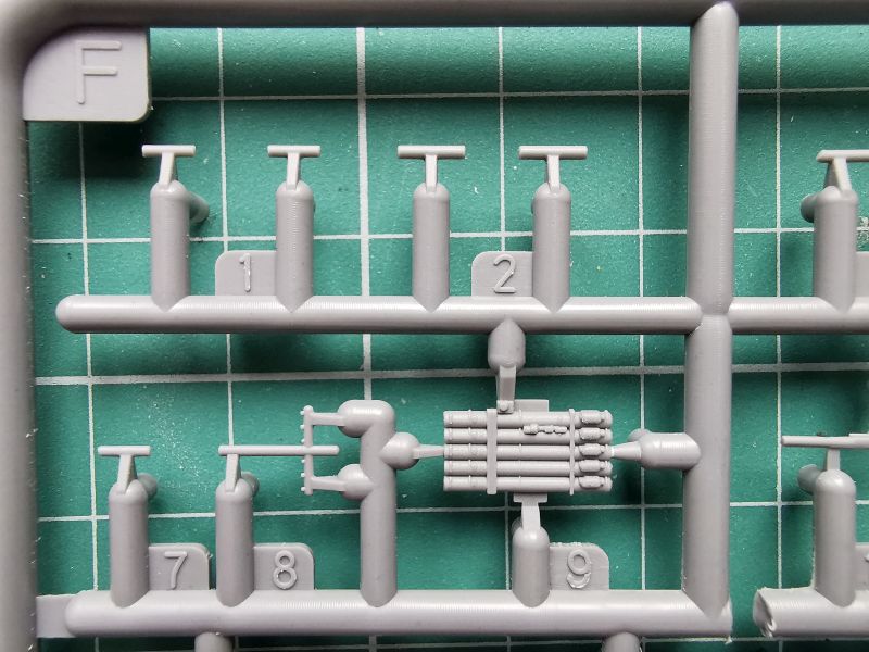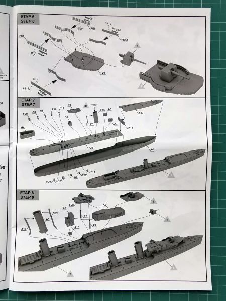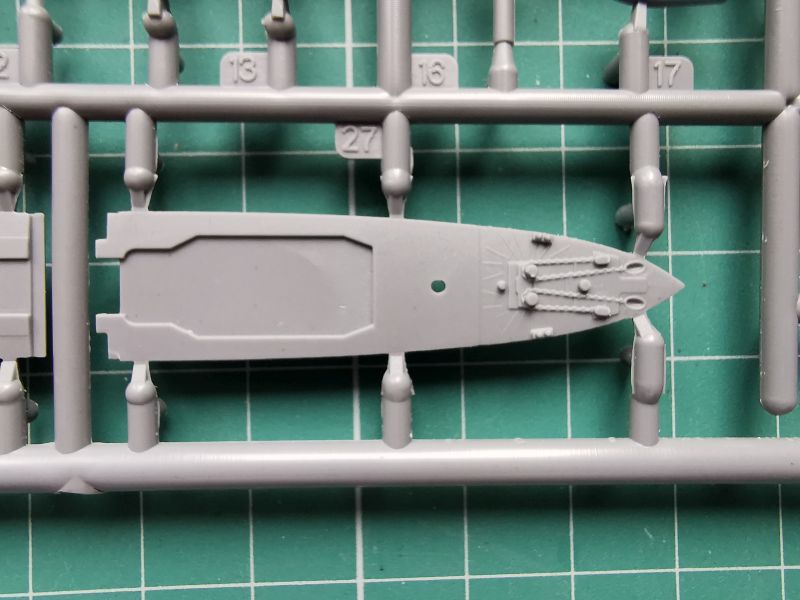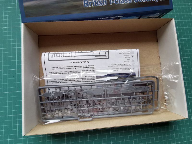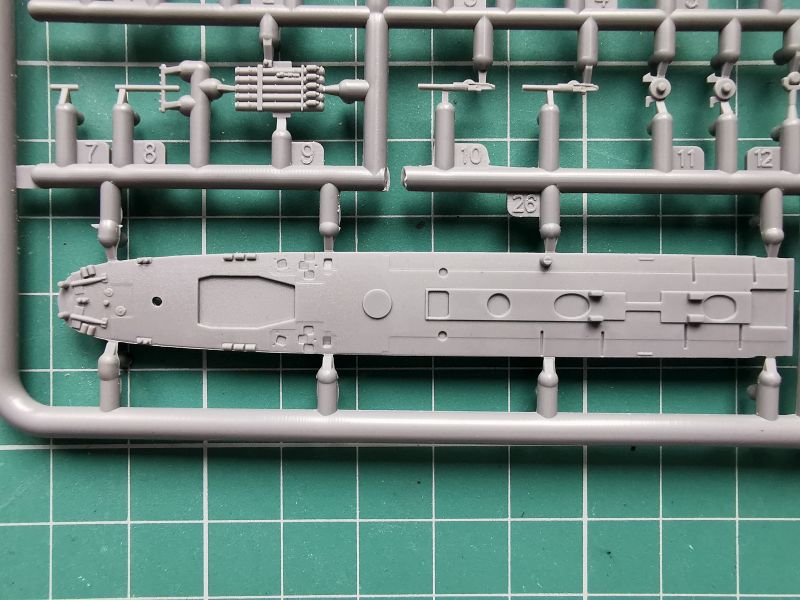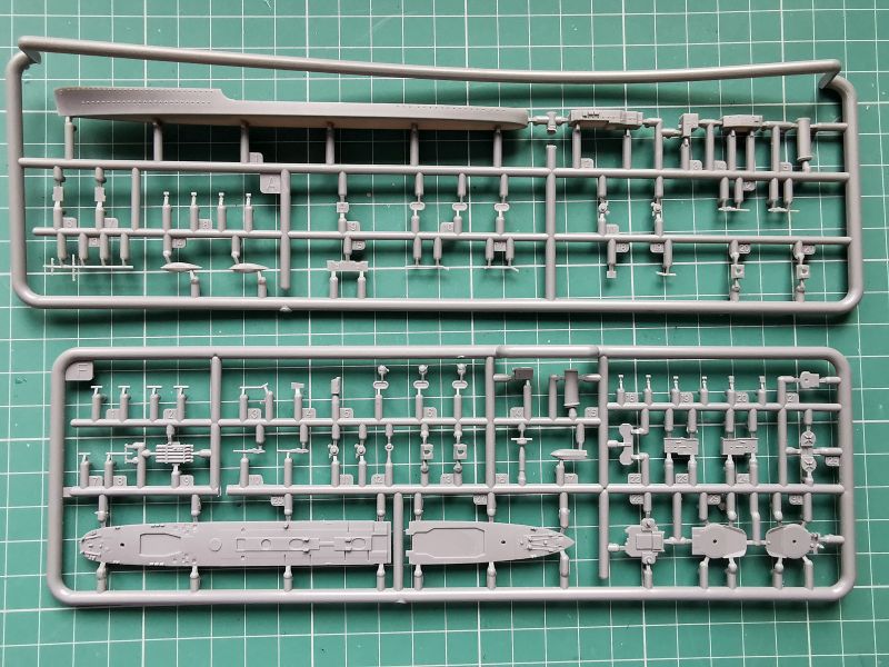 Zestaw składa się z dwóch ramek. „A” czyli standardowa dla wszystkich zestawów, oraz „F” na której znalazły się pokłady pomost bojowy, część nadbudówek, tylny komin oraz sporo detali uzbrojenia i wyposażenia.