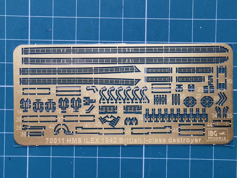 Fototrawiona blaszka została zaprojektowana specjalnie pod ten zestaw. Znajduje się na niej wszystko, co potrzeba, aby nasza miniaturka wyglądała naprawdę efektownie, czyli relingi, schodnie, żurawiki i temu podobne detale. Trzeba zresztą sobie jasno powiedzieć, że blaszki w tego typu modelach są bardzo wskazane. Przy modelach samolotów czy pojazdów można sobie bez nich jakoś poradzić, ale w przypadku mikromodeli raczej nie. Model okrętu bez relingów nie wygląda dobrze, zaś wykonanie relingów w skali 1/700 od podstaw jest oczywiście możliwe, ale nie w moim przypadku, pewnie nie odosobnionym. Dlatego dobrze, że w przypadku mikromodeli okrętów IBG Models, blaszka jest standardem a nie opcją.
