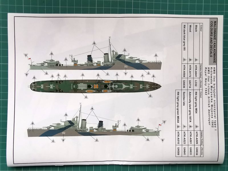 Arkusik z kalkomaniami jest za to standardowy dla całej serii. Oznaczenia taktyczne i bandery Royal Navy i PMW. Model można wykonać w malowaniu z 1942r. jest to efektowny, trójkolorowy kamuflaż. Paleta kolorów podana dla Hataki i Lifecolor i co ważne podane są także oryginalne nazwy kolorów stosowanych w Royal Navy. Ta ostatnia uwaga odnosi się do wszystkich modeli serii.