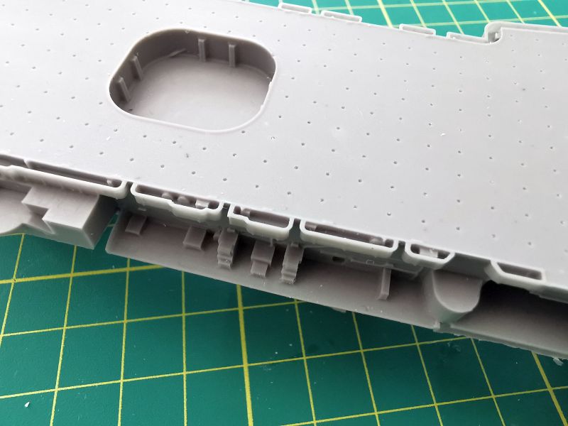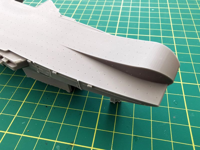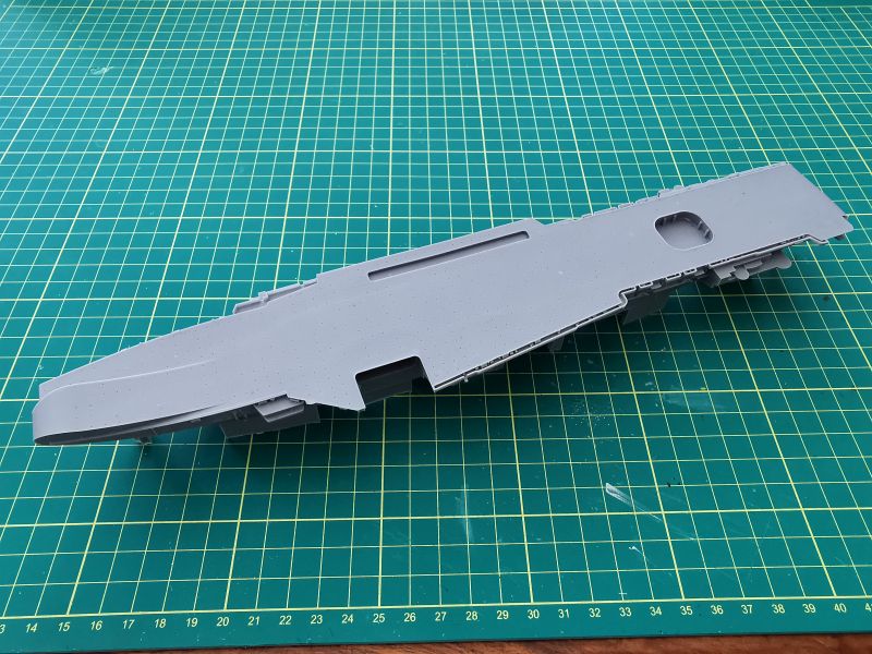 Trzeba przyznać, że z tym technologicznym wyzwaniem producent poradził sobie bardzo dobrze. Detale zarówno na burtach, jak i wokół pokładu startowego, a jest ich dość pokaźna ilość odtworzono bardzo finezyjnie i co ważne wyraźnie. Nie ma co prawda pokładów ochronnych na dziobie i rufie, ale ich prześwity są naprawdę niewielkie. W większość z nich wkleimy knagi oraz fragmenty relingu, co powinno zakamuflować, barak pokładów wewnątrz kadłuba. Bardzo pozytywne wrażenie robią galeryjki wokół pokładu. Okalające je imitacje stalowych balustrad są cienkie i wyraźne, mają także odtworzone imitacje wzmocnień, zaś na pokładach galeryjek jest naprawdę sporo wyposażenia. Sam zaś pokład ma zaimitowane miejsca do kotwienia samolotów.