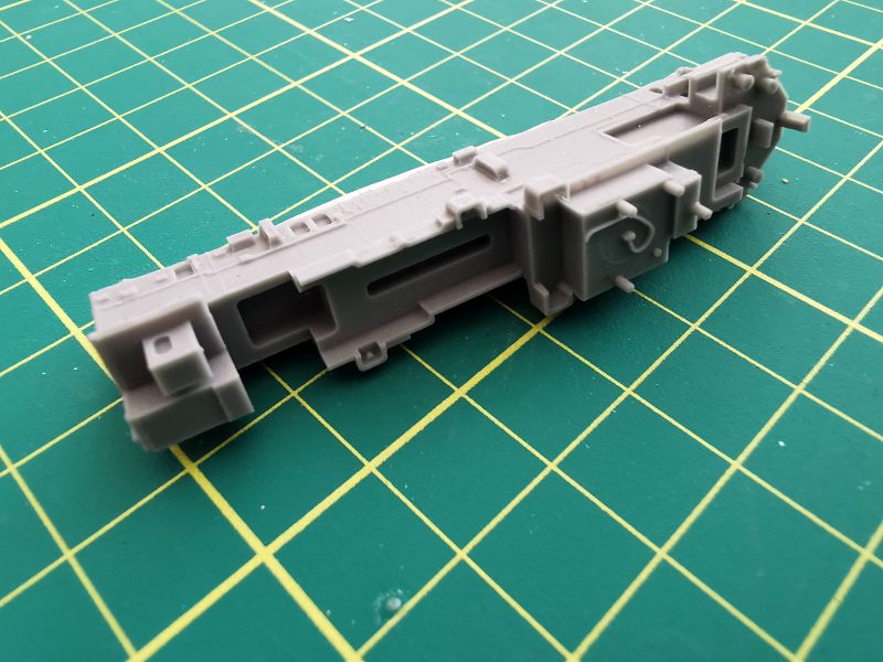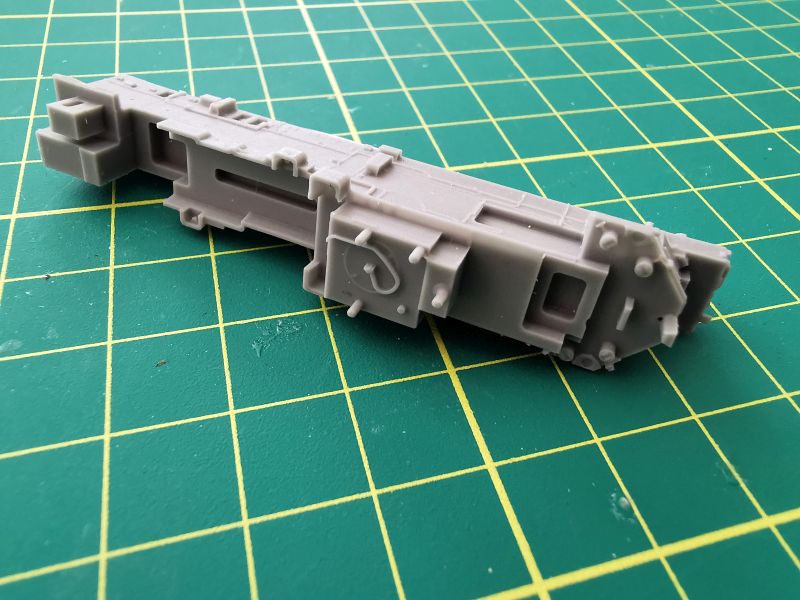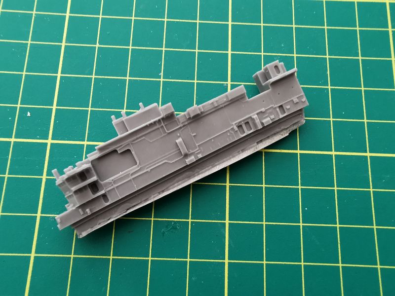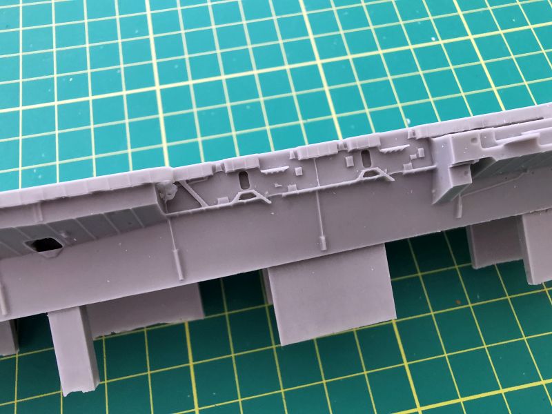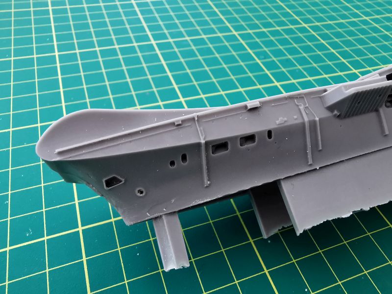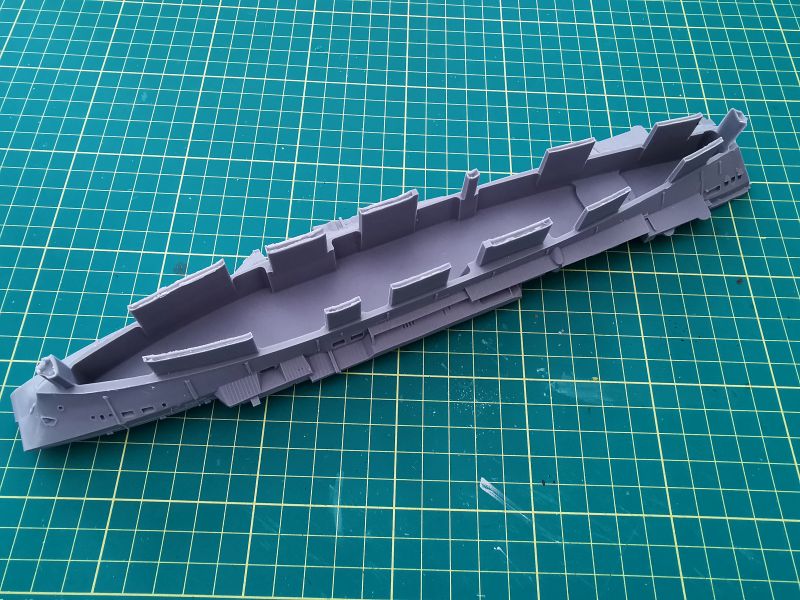Nie trzeb dodawać, że pierwsze na co zwrócimy uwagę to bryła kadłuba. Pojedynczy, duży odlew o skomplikowanym kształcie musiał stanowić spore wyzwanie nie tylko dla projektanta, ale także osób odpowiedzialnych za techniczną stronę przygotowania form i wykonania odlewów. Co ciekawe, kadłub jest pusty w środku, posiada natomiast na linii wodnej liczne wlewy technologiczne, które oczywiście trzeba będzie obciąć. Znawcy technicznej strony zagadnienia uświadomili mnie natomiast, że jest to podyktowane nie tyle chęcią oszczędności żywicy, ale zmniejszeniem masy niemałego przecież elementu.