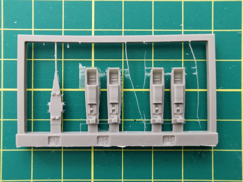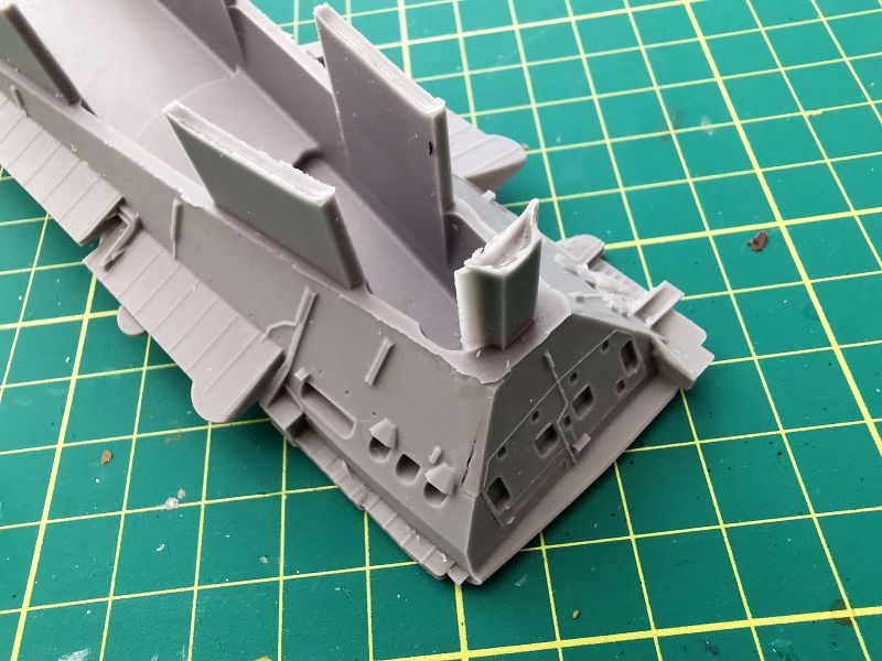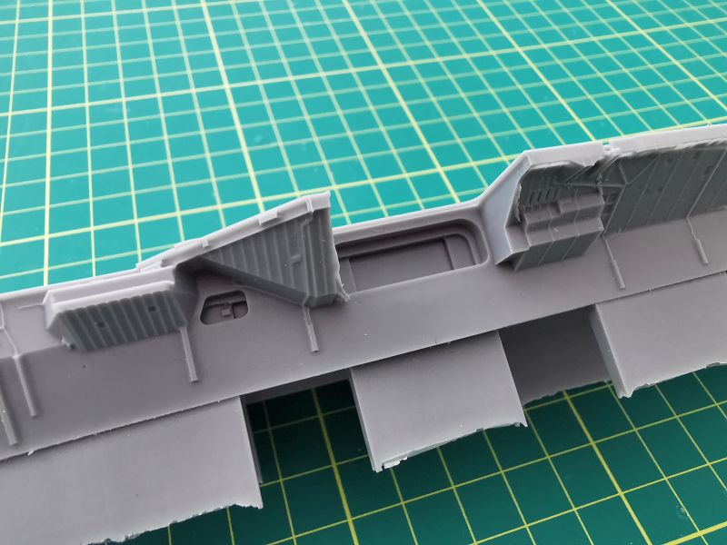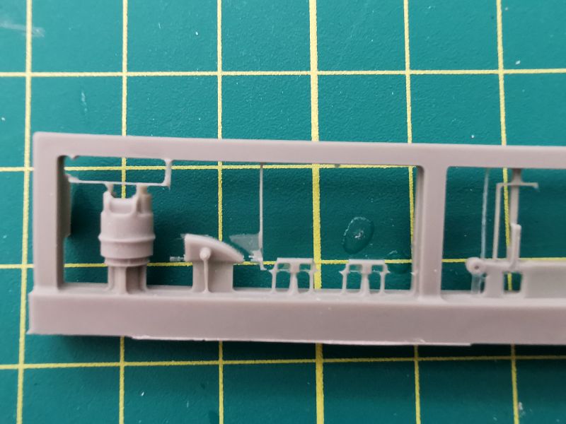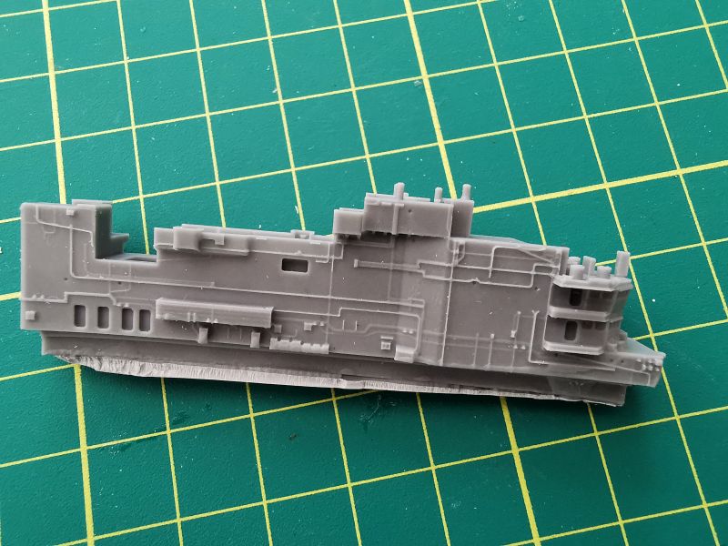 Drugim jednolitym elementem modelu jest odlew nadbudówki, czyli wysepki. Jakość jej wykonania jest taka, jak w przypadku kadłuba, czyli nic na skróty. Detale są bardzo wyraźne i jest ich sporo z równego rodzaju przewodami biegnącymi po całej powierzchni ścian bocznych. Trzeba też zauważyć, że wszystkie drzwi są na blaszkach i można je wykonać także jako otwarte, więc w nadbudówce mamy tylko otwory.