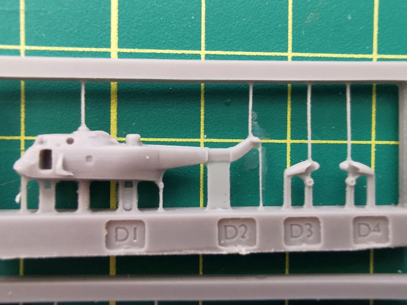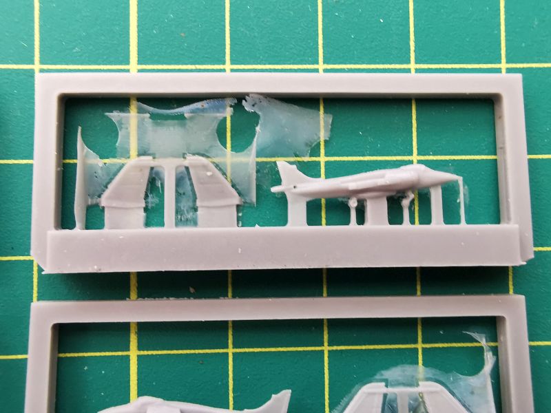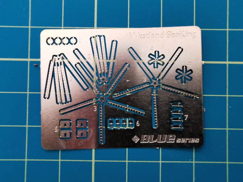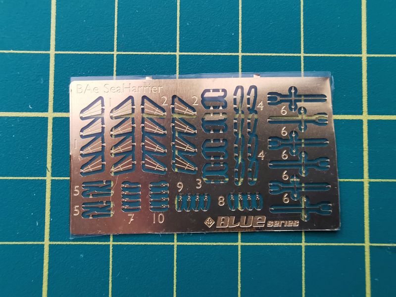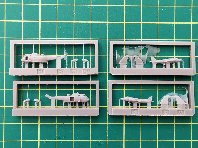 Każda miniatura składa z ramki z podstawowymi detalami żywicznymi, takimi jak kadłuby, skrzydła czy w przypadku śmigłowców podwozie główne, umieszczone w charakterystycznych pływakach. Elementy żywiczne uzupełniono oczywiście blaszkami. W przypadku śmigłowców są na nich wirniki, stateczniki oraz drzwi boczne, które możemy wykonać jako otwarte. Wirnik główny w każdym śmigłowcu można wykonać jako rozłożony, lub złożony. Blaszka do Harrierów zawiera stateczniki poziome, boczne kółka podwozia wraz z goleniami, pylony do podwieszania uzbrojenia. Są także wodzidła do przetaczania samolotów po pokładzie. Co ciekawe tych, detali na blaszce starczy na przynajmniej cztery Harriery, więc trochę dziwi, że w zestawie znajdują się tylko dwa komplety elementów z żywicy.