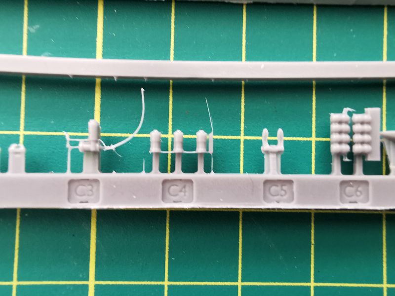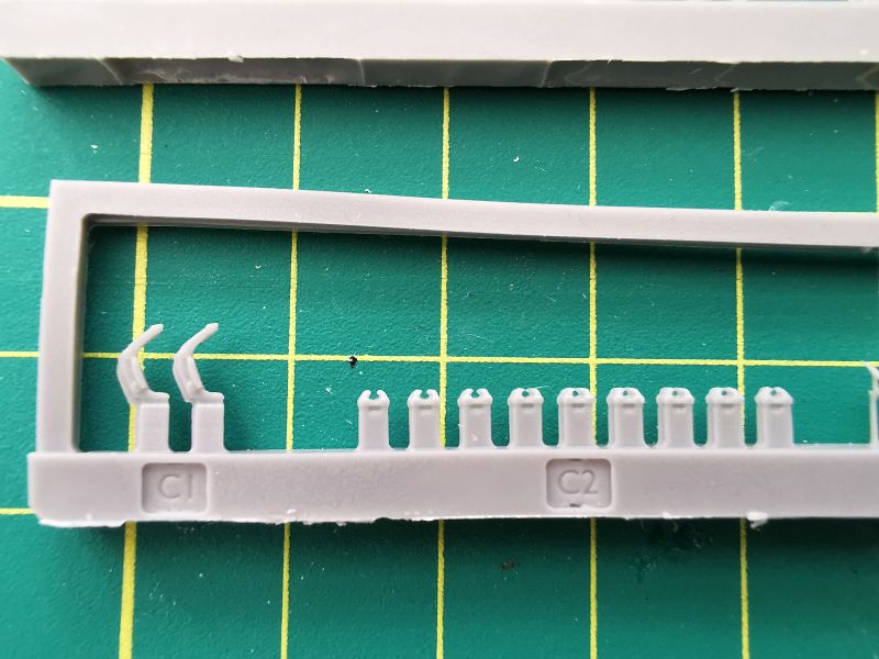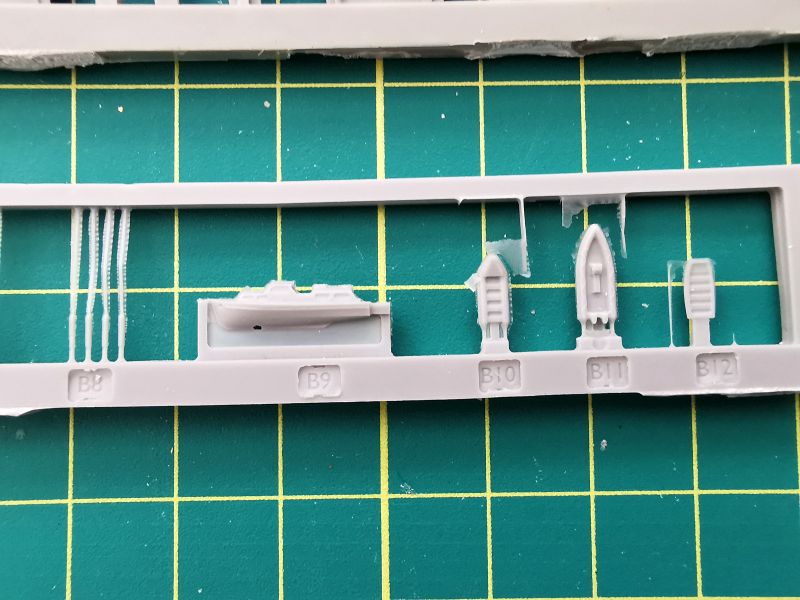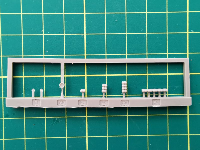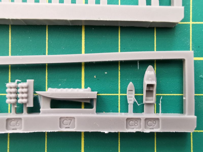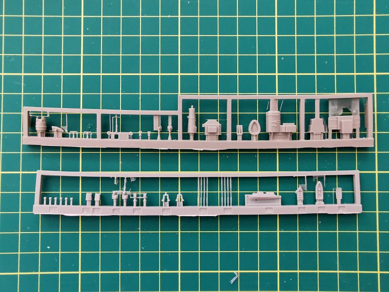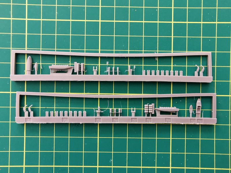 Trzeba przyznać, że bardzo pomysłowo rozwiązano sposób odlewania wszystkich drobnych detali. Odlewy wykonano w postaci ramek. Ma to tę zaletę, że na ramkach umieszczono numerację części, co później ułatwi na połapanie się w tym wszystkim na etapie klejenia. Dwie duże ramki to detale nadbudówki, takie jak komin oraz przedni maszt, a także spora ilość wyposażenia ratunkowego, elektronicznego i pokładowego.