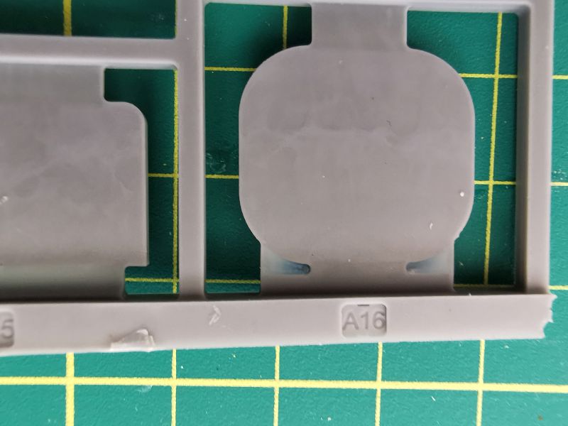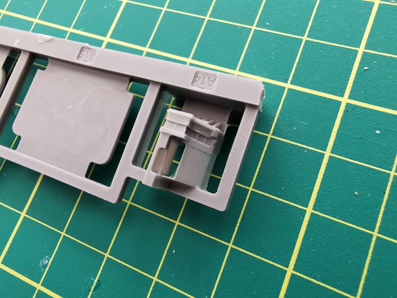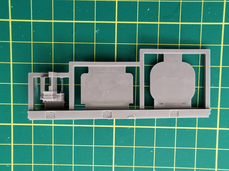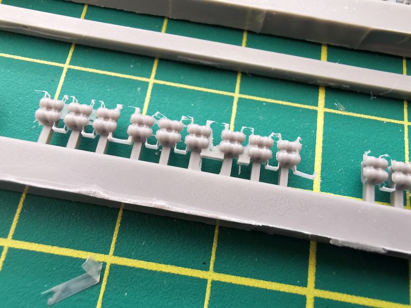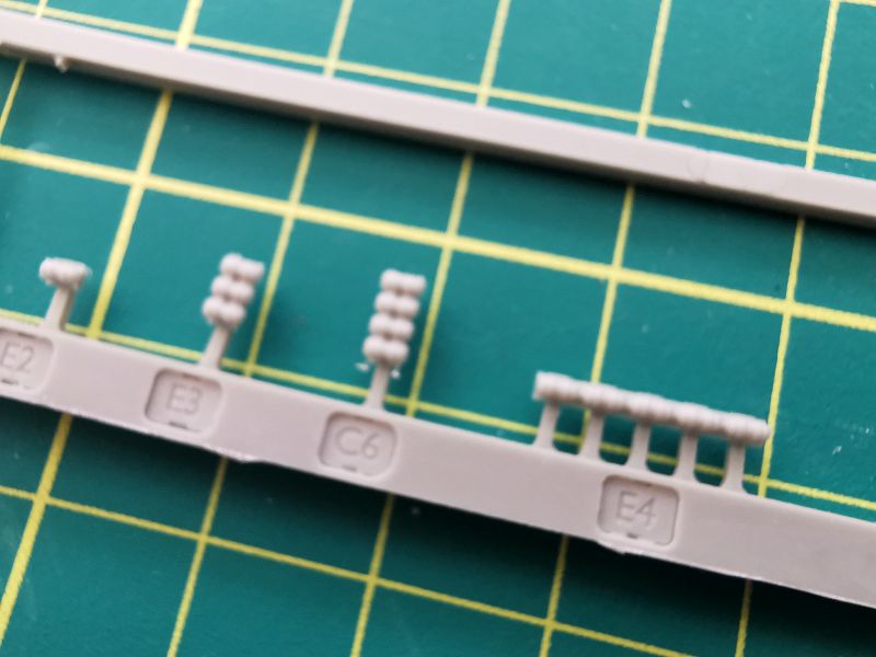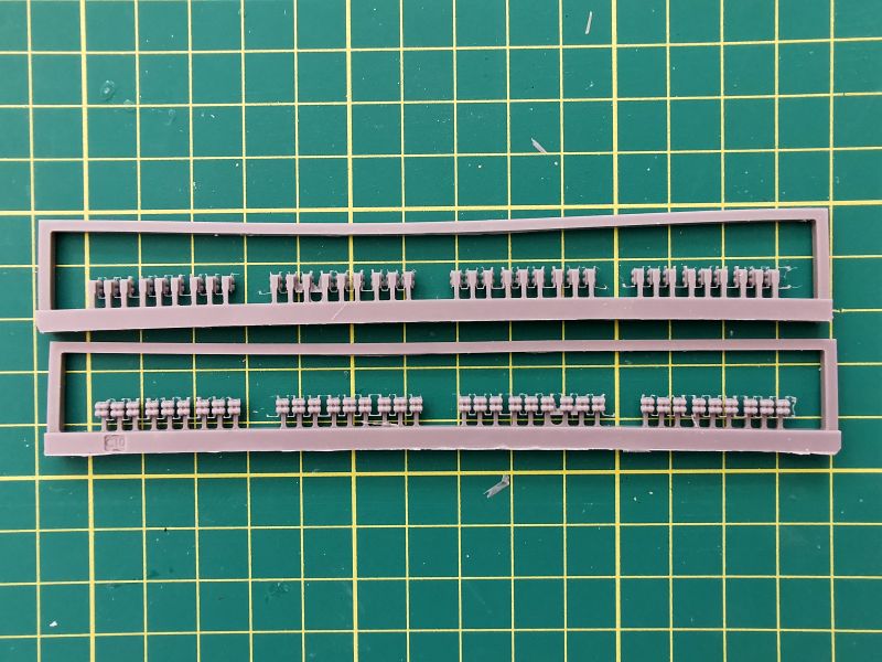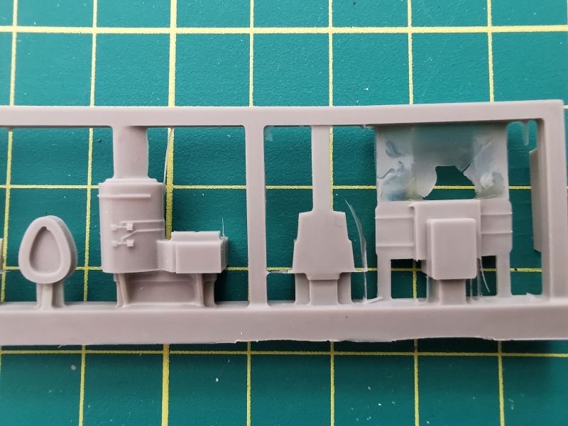 Trzeba przyznać, że bardzo pomysłowo rozwiązano sposób odlewania wszystkich drobnych detali. Odlewy wykonano w postaci ramek. Ma to tę zaletę, że na ramkach umieszczono numerację części, co później ułatwi na połapanie się w tym wszystkim na etapie klejenia. Dwie duże ramki to detale nadbudówki, takie jak komin oraz przedni maszt, a także spora ilość wyposażenia ratunkowego, elektronicznego i pokładowego.