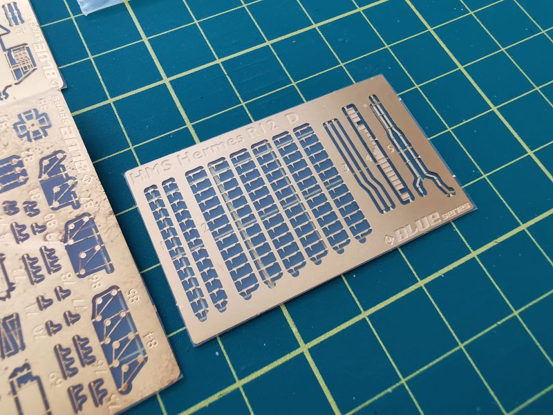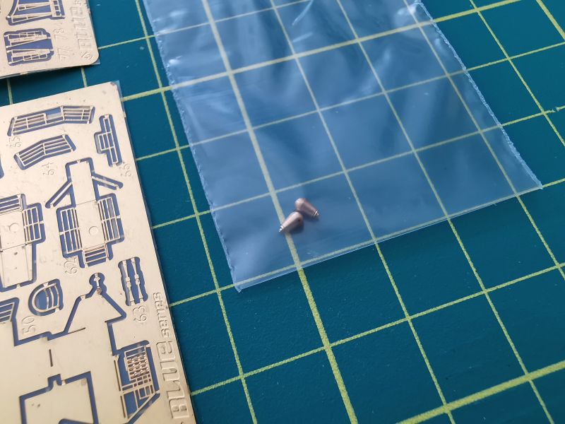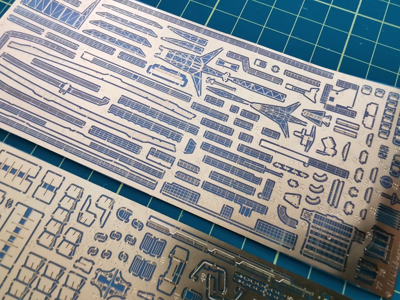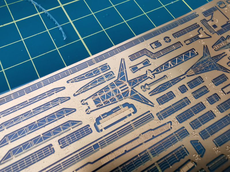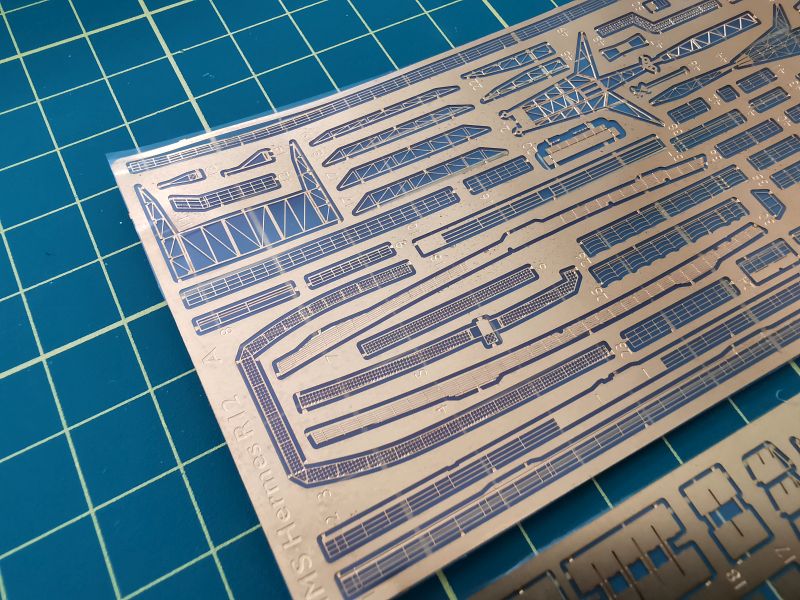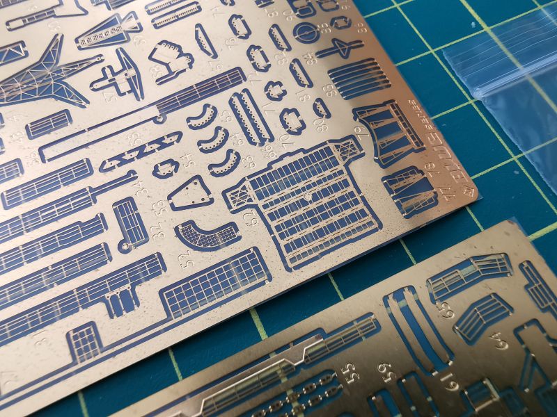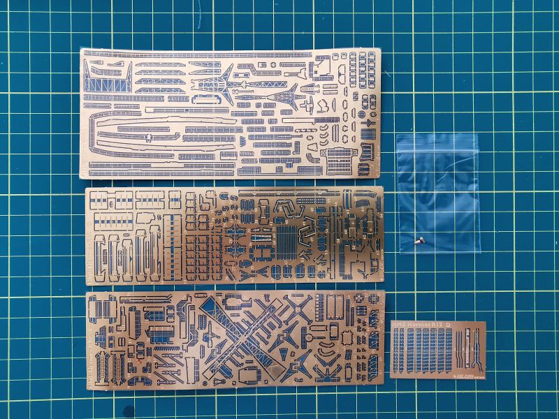 Szanujący się model okrętu wykonany w technologii odlewu żywicznego nie może się obejść także bez elementów fot otrawionych. Producent modelu zdawał sobie z tego doskonale sprawę i blaszek w zestawie nie poskąpił. Niepozorna torebka kryje w sobie trzy duże blachy, jedną mniejszą oraz dwie wytoczone z metalu anteny. Nie są to jednak wszystkie detale fototrawione, jakie zawiera zestaw, ale o tym później.