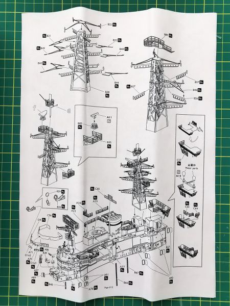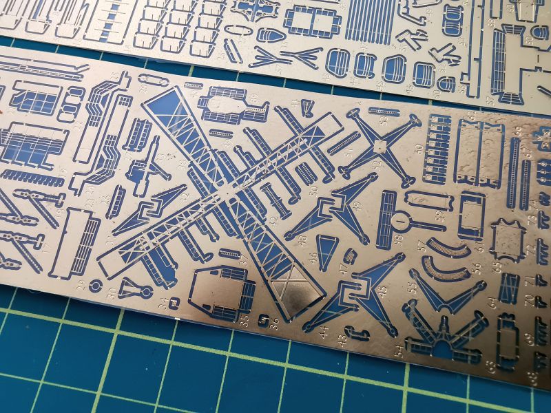 Najpierw może obejrzyjmy zdjęcia ukazujące całe bogactwo detali rozmieszczone na blaszkach. Nie są to tylko relingi, czy rzeczy najistotniejsze. O nie, tu jest wszystko, bo wszystko jest istotne. Cała konstrukcja głównego masztu radarowego, elektronika, siatki wokół pokładu, ażurowa konstrukcja windy, dźwigi czy wreszcie stelaże na tratwy ratunkowe. Można oczywiście wymieniać dalej, bo repertuar jest naprawdę spory, co może uczynić z naszego modelu bardzo wierną miniaturę. Trzeba najpierw poświęcić sporo uwagi na dokładne przestudiowanie instrukcji, żeby się zorientować w sposobie oraz kolejności montażu poszczególnych detali. Dodam tylko, że blaszki są z dwóch stron zabezpieczone folią.