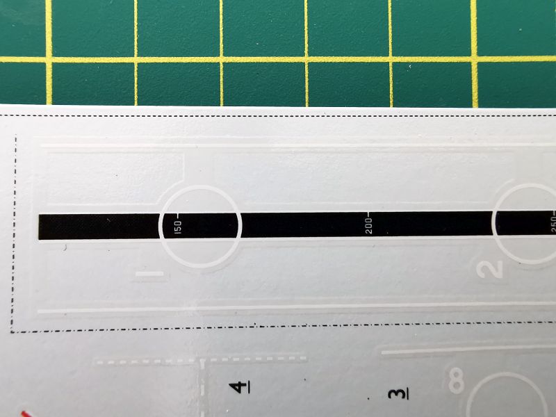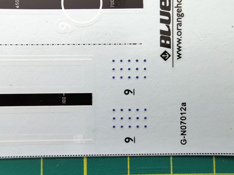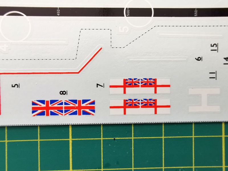 Kalkomania dołączona do modelu to dość spory arkusik, na którym znajdują się oznaczenia wymalowane na pokładzie startowym, oznaczenia taktyczne na nadbudówkę, kokardy na miniatury osprzętu lotniczego a także bandery. Jest to najsłabszy punkt zestawu. O ile oznaczenia na pokład startowy mają ładnie oddane wszystkie szczegóły, o tyle bandery mają mocno rzucające się w oczy przesunięcia kolorów. Jeżeli je ładnie ułożymy, tak żeby nie były zbytnio rozprostowane, to nie powinno być problemu. W innym wypadku, musimy zastąpić je czymś lepszym. Trzeba będzie natomiast bardzo uważać przy nakładaniu kalkomanii na pokład startowy. Są one bardzo długie i nie mają błony na całej powierzchni. Mogą się przez to zwijać i rwać. Zatem bardzo uważamy przy tej czynności, która niewątpliwie będzie rzutować na ostateczny wygląd budowanej przez nas miniatury.