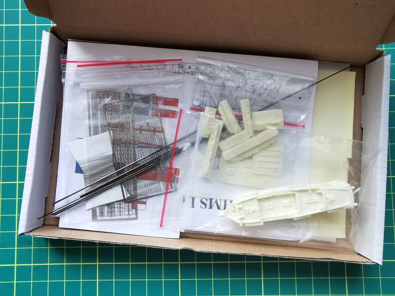 Zapakowano go w niewielkie kartonowe pudełko, ozdobione jak wspomniałem nalepką ze zdjęciem modelu prototypu wykonanego w konwencji gier bitewnych a także podstawowe informacje o zestawie. Taki sposób pakowania zestawów jest standardem firmy Mikrostocznia i pod tym względem nic się nie zmieniło. W środku znajdziemy zapakowane w foliowe torebki elementy żywiczne oraz blaszki fototrawione a także wszystko, co potrzebne jest do wykonania masztów i takielunku, bandery oraz instrukcję montażu i malowania.