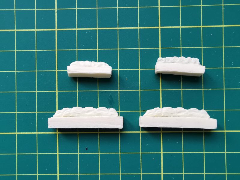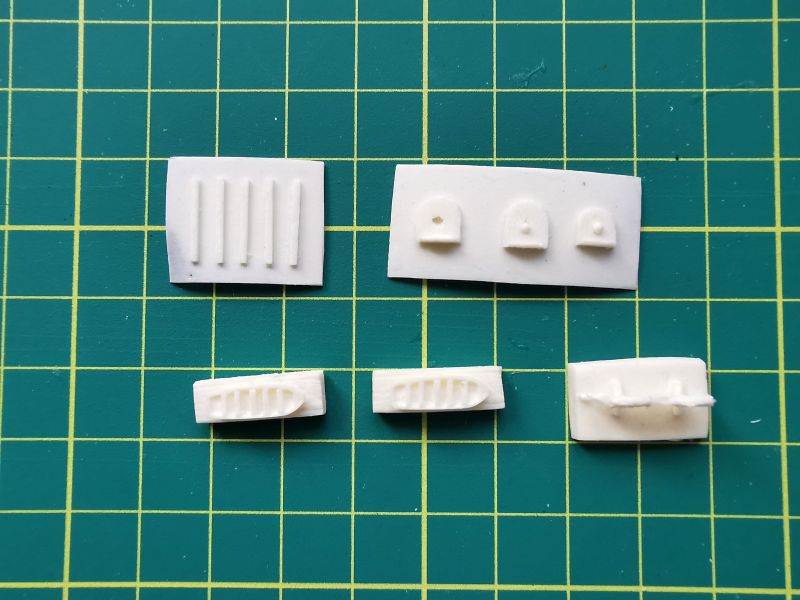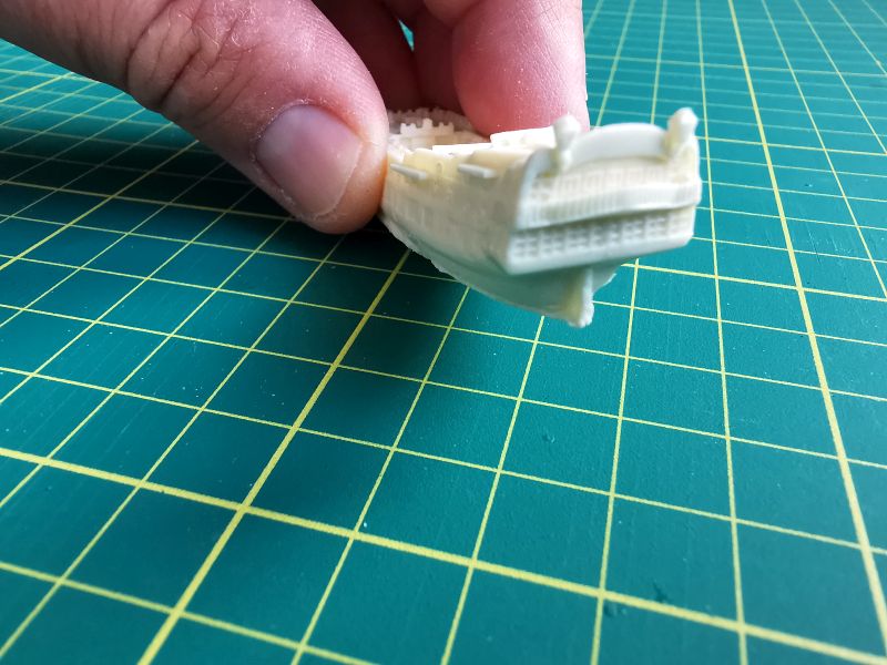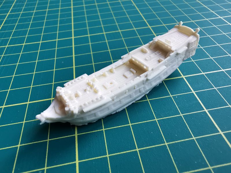 Pozostałe detale żywiczne, to marsy do zamontowania na masztach, szalupy, belki nad lukiem pokładu głównego oraz kotwice. Otrzymujemy także cztery zrefowane żagle, to bardzo dobry patent, stosowany od pewnego czasu w modelach Mikrostoczni, o czym miałem okazję przekonać się osobiście klejąc model okrętu korsarskiego „Zemsta Królowej Anny”.