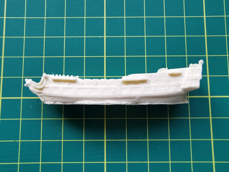 Podstawowe elementy zestawu odlane zostały z jasno kremowej żywicy. Ważne że nie zawierają bąbelków powietrza, które przy dość skomplikowanej bryle kadłuba na pewno utrudniłyby budowę. Kadłub jak to bywa przy takich modelach jest zasadniczym, podstawowym elementem zestawu. Projektant zadbał, aby znalazło się na nim maksymalnie dużo szczegółów i trzeba przyznać, że się to udało. Na pokładzie mamy większość wyposażenia i uzbrojenia. Bardzo ładnie odtworzono także szczegóły dziobnicy oraz pawęży rufowej. Pamiętajmy, że to bardzo bogato zdobione miejsca w prawdziwych okrętach z tego okresu, co będzie miało swój wpływ na wygląd modelu. Jedyne, co będzie wymagało nieco obróbki to miejsca przy linii wodnej, gdzie jest trochę nadlewek. Trzeba będzie także trochę uwagi poświęcić detalom na burtach, listwom i kazamatom, są one nieco rozmyte i dobrze nad nimi popracować.