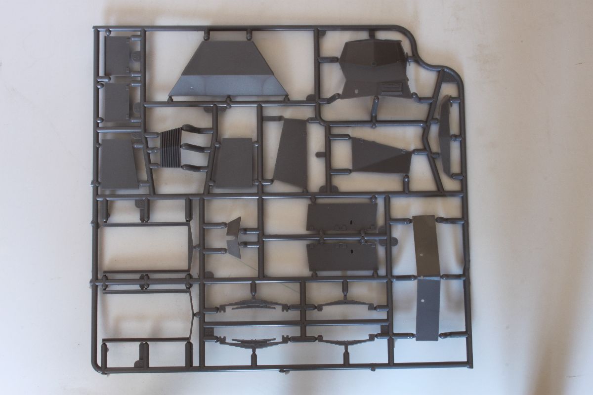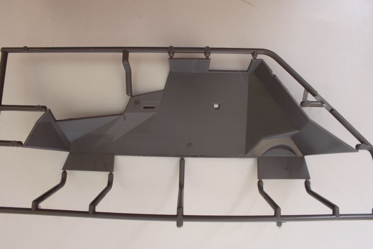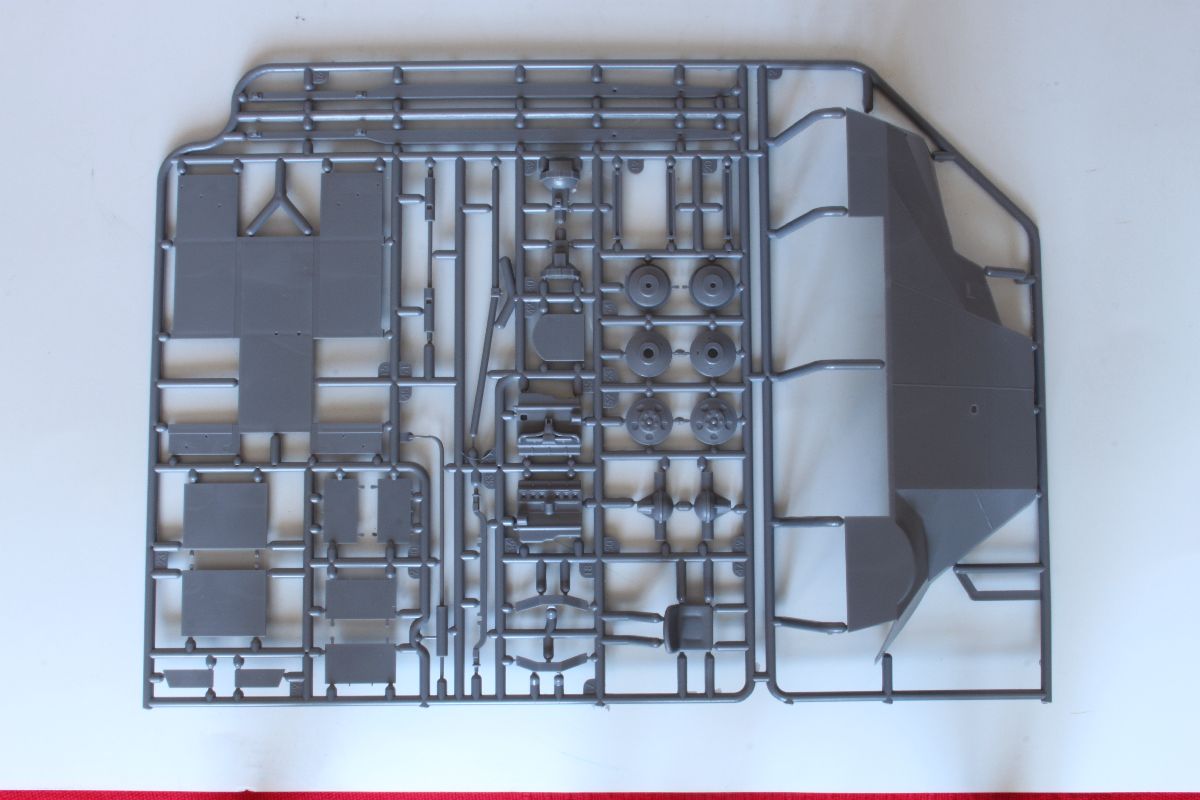 Elementy z polistyrenu prezentują niezły poziom, ale po modelach PZL-23, czy CL-II oczekiwałem czegoś lepszego. Zacznijmy jednak od plusów. Model jest dość szczegółowy, posiada makietę silnika i przedziału załogi. Większość włazów oraz pokryw możemy wykonać w pozycji wychylonej. Dysponujemy również uzbrojeniem w postaci karabinu maszynowego DP oraz granatnika Piat, oraz amunicji do nich. Nieźle wykonane, ale również widziałem lepsze repliki. Silnik i przedział kierowcy trzeba uzupełniać, detalować, brakuje takich rzeczy jak, dźwignia zmiany biegów, pedałów sprzęgła, gazu i hamulca, a to wszystko jest doskonale widoczne przez otwarte włazy zarówno z góry pojazdu, jak w jego podłodze. Również we własnym zakresie musimy wykonać fotel strzelca, ławki dla desantu oraz uchwyty na amunicję. Poza tym warto popracować nad detalami sinika, poprzez dodanie przewodów oraz wszelkiej maści drobiazgów które poprawią jego wygląd. Podobnie rzecz się ma z fakturą powierzchni kadłuba. Tę wewnętrzną trzeba oczyścić z śladów po formie, zaś zewnętrzna, jest w sumie ok, ale koniecznej jest poprawienie linii spawów, które są zbyt delikatne i zbyt płaskie.