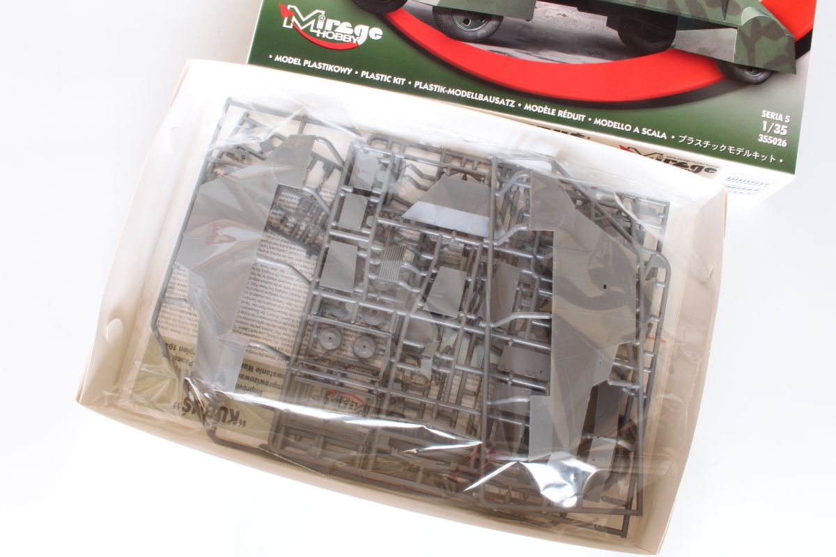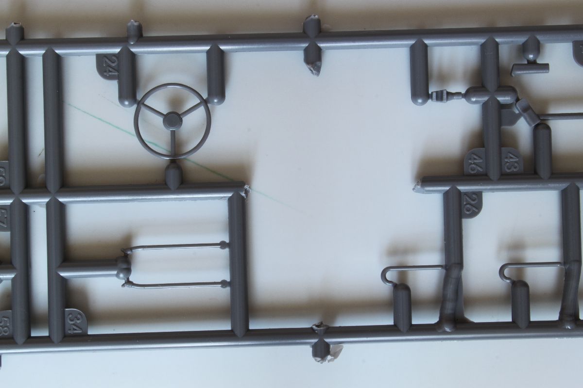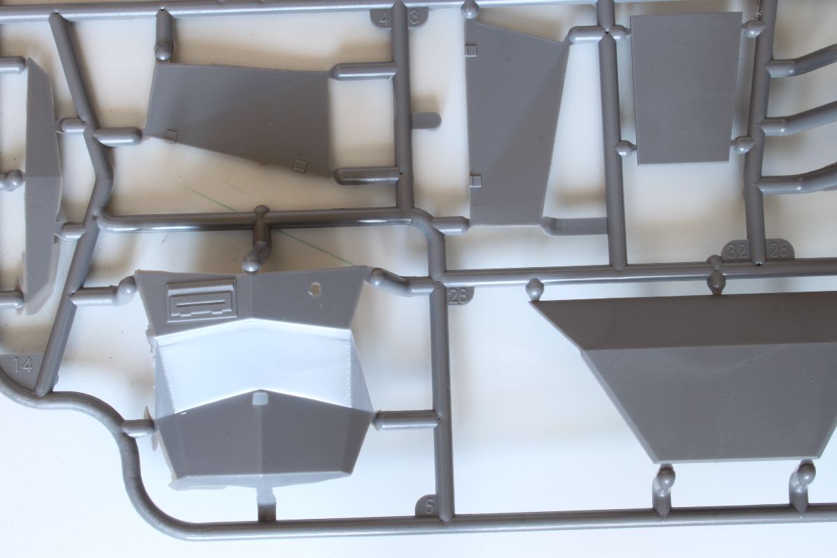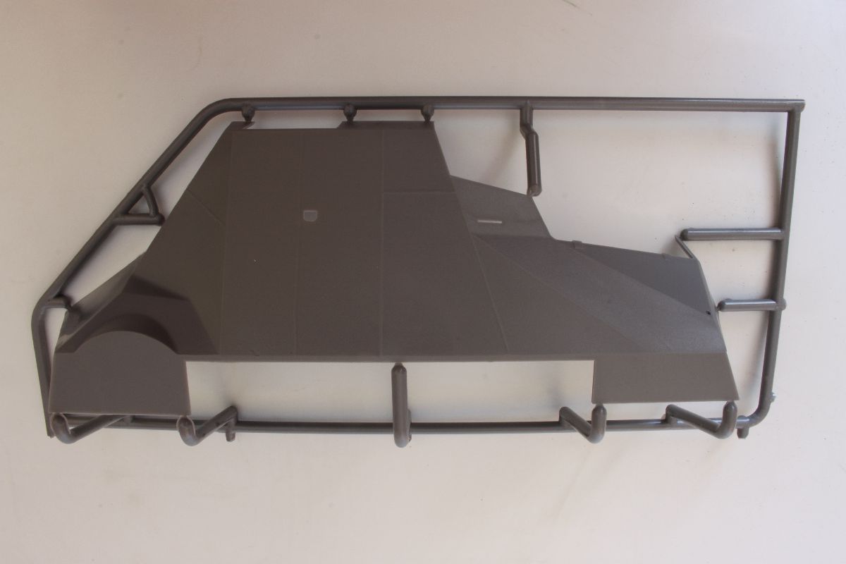 Elementy z polistyrenu prezentują niezły poziom, ale po modelach PZL-23, czy CL-II oczekiwałem czegoś lepszego. Zacznijmy jednak od plusów. Model jest dość szczegółowy, posiada makietę silnika i przedziału załogi. Większość włazów oraz pokryw możemy wykonać w pozycji wychylonej. Dysponujemy również uzbrojeniem w postaci karabinu maszynowego DP oraz granatnika Piat, oraz amunicji do nich. Nieźle wykonane, ale również widziałem lepsze repliki. Silnik i przedział kierowcy trzeba uzupełniać, detalować, brakuje takich rzeczy jak, dźwignia zmiany biegów, pedałów sprzęgła, gazu i hamulca, a to wszystko jest doskonale widoczne przez otwarte włazy zarówno z góry pojazdu, jak w jego podłodze. Również we własnym zakresie musimy wykonać fotel strzelca, ławki dla desantu oraz uchwyty na amunicję. Poza tym warto popracować nad detalami sinika, poprzez dodanie przewodów oraz wszelkiej maści drobiazgów które poprawią jego wygląd. Podobnie rzecz się ma z fakturą powierzchni kadłuba. Tę wewnętrzną trzeba oczyścić z śladów po formie, zaś zewnętrzna, jest w sumie ok, ale koniecznej jest poprawienie linii spawów, które są zbyt delikatne i zbyt płaskie.