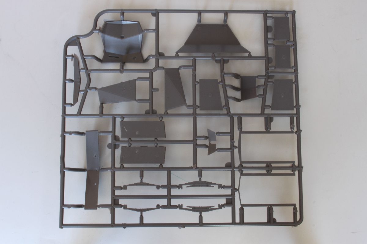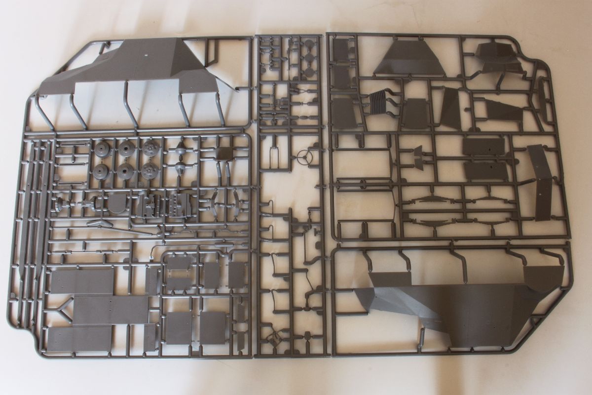 Zestaw zapakowano w efektowne i estetyczne pudełko, na którym znajdziemy dość sporo informacji o samym pojeździe jak i modelu. Box-art, również sprawia bardzo miłe wrażenie. Miniatura składa się z 83 elementów wykonanych z ciemnoszarego tworzywa zgrupowanych w czterech ramkach, a właściwie w… jednej, podzielonej na cztery mniejsze, tak, aby można było zmieścić w pudełku. Uzupełnieniem części z tworzywa są gumowe opony.